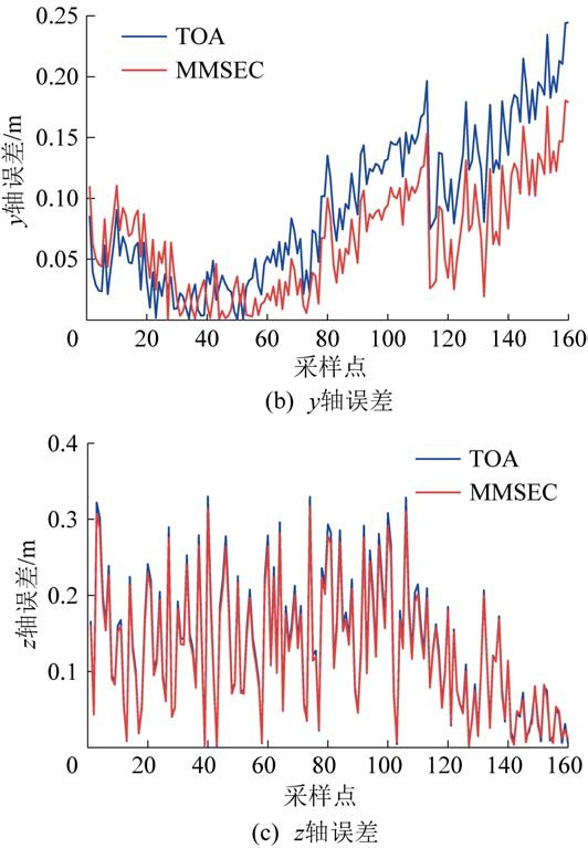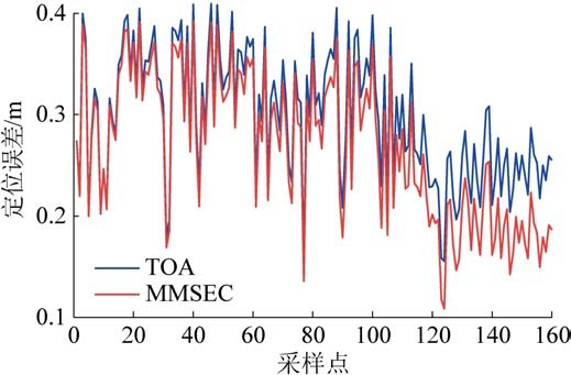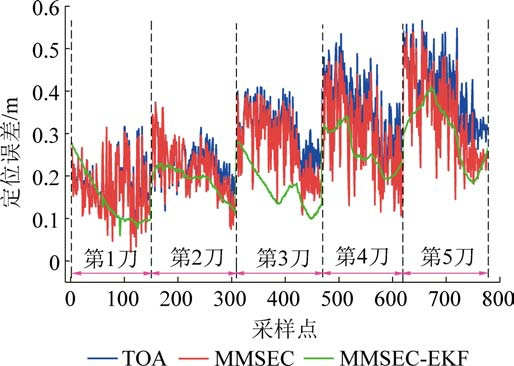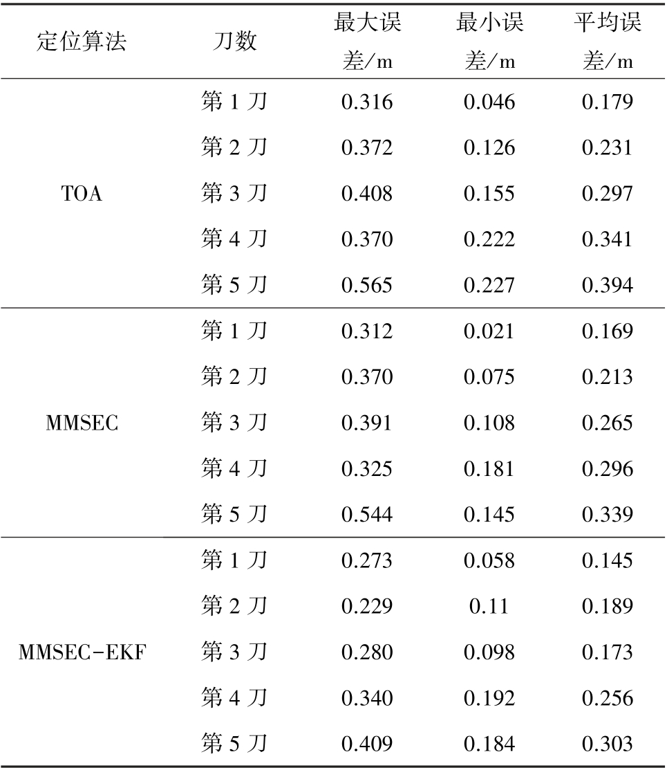 定位算法 刀数 最大误差/m最小误差/m平均误差/m TOA第1 刀 0.316 0.046 0.179第2 刀 0.372 0.126 0.231第3 刀 0.408 0.155 0.297第4 刀 0.370 0.222 0.341第5 刀 0.565 0.227 0.394 MMSEC第1 刀 0.312 0.021 0.169第2 刀 0.370 0.075 0.213第3 刀 0.391 0.108 0.265第4 刀 0.325 0.181 0.296第5 刀 0.544 0.145 0.339第1 刀 0.273 0.058 0.145 MMSEC-EKF第2 刀 0.229 0.11 0.189第3 刀 0.280 0.098 0.173第4 刀 0.340 0.192 0.256第5 刀 0.409 0.184 0.303