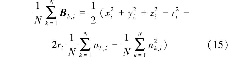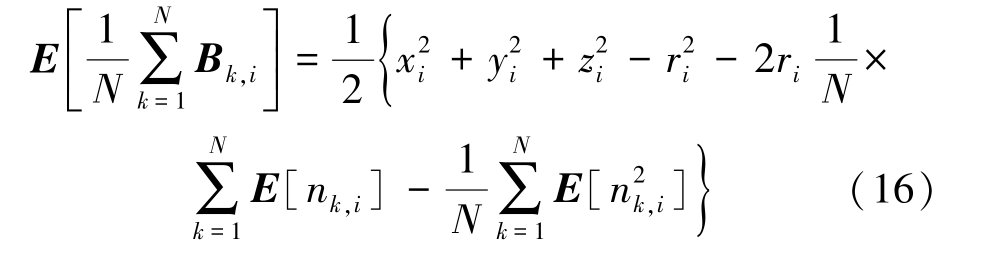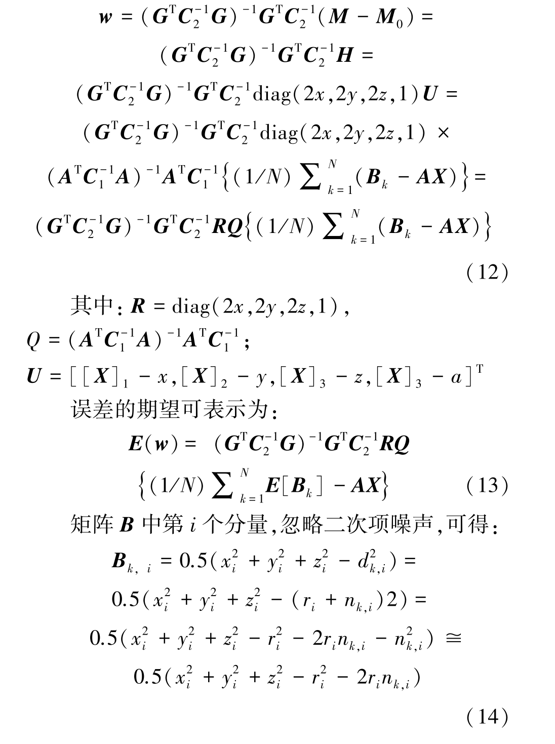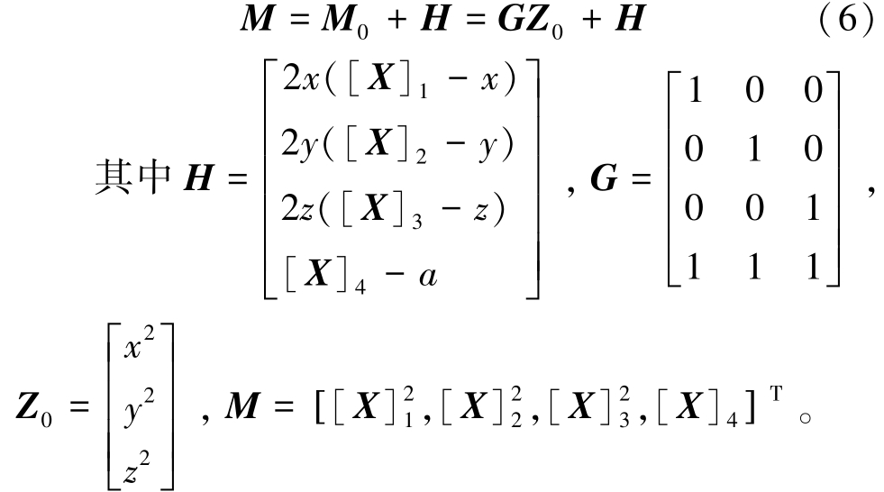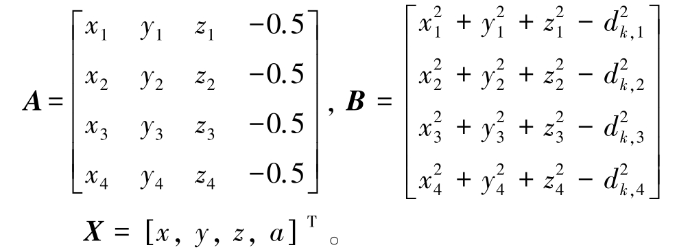 在UWB 定位系统中,根据定位终端与4 个基站之间的测量距离,建立如下观测方程组: