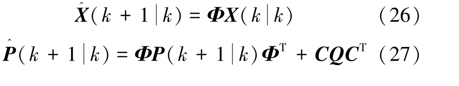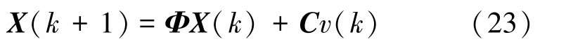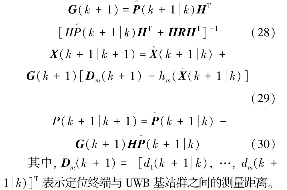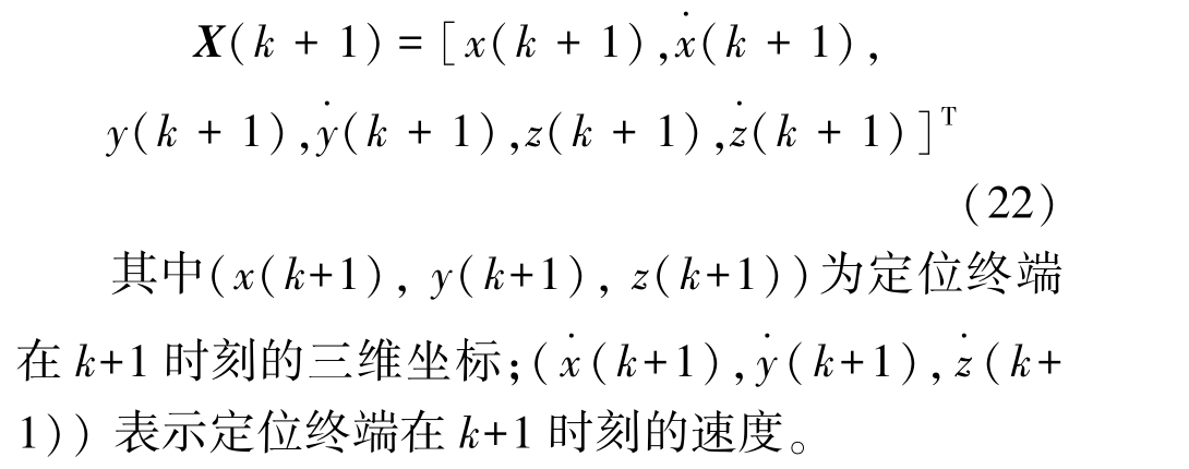 由于MMSEC 收缩估计并未消除测距误差对定位精度的影响,其定位结果依然具有较大的误差,需要对定位终端的坐标估计值进行进一步的优化。EKF 在定位系统中有着广泛的应用,因此采用EKF对定位结果进行滤波处理,提高定位精度。 定位终端在k+1 时刻的状态向量可表示为: