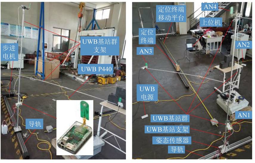 为验证所提方法的准确性和有效性,所有的基站及定位终端,均使用Time Domain 公司生产的UWB P440 模块。 将4 个UWB 基站安装在UWB 支架上,调整UWB 基站的相对位置,使4 个基站在水平面的投影为V 型,这种部署方式能够获得较好的定位精度[25]。 将蓝牙姿态传感器固定在UWB 支架上,获取基站群迁移后姿态角。 定位终端模块安装在移动平台上,模拟采煤机的运动,如图2 所示,设置定位终端的移动速度为0.1 m/s,假设采煤机每次的进刀量为0.8 m, UWB 基站群每次的迁移距离为0.8 m, 第1 刀截割时,4 个基站的坐标分别为AN1 (0.131,0.126 ,0.636), AN2 (1.283, 1.131,0.944), AN3 (- 0. 732, 1. 581, 1. 117), AN4(0.104, 0.226, 2.094),每刀截割完成后,根据基站群迁移的距离,分别解算每个UWB 基站的坐标。