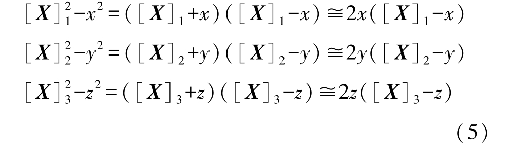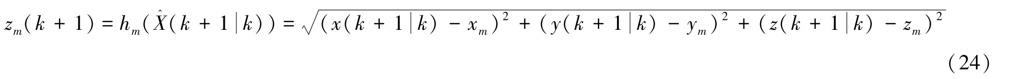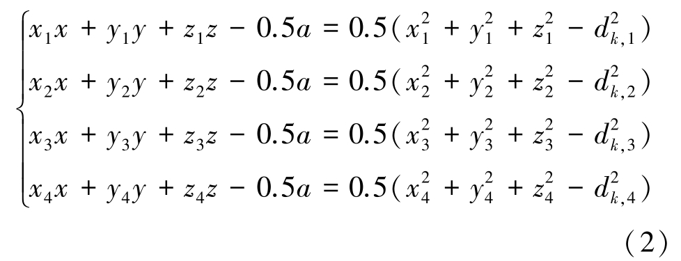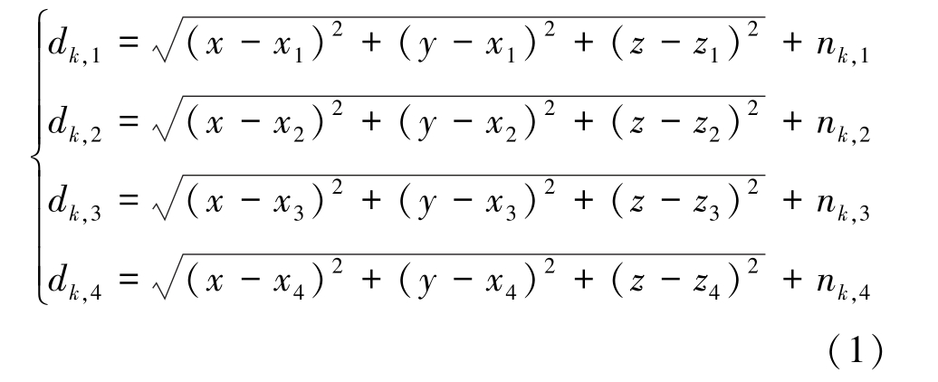 式中:dk,1, dk,2, dk,3, dk,4分别为在k 时刻定位终端与4 个基站之间的距离;nk,1, nk,2, nk,3, nk,4分别为高斯白噪声;(x1, y1, z1), (x2, y2, z2), (x3, y3,z3), (x4, y4, z4)为4 个UWB 基站的坐标,(x, y,z)为定位终端的坐标。 忽略测量噪声,式(1)两边平方,整理得: