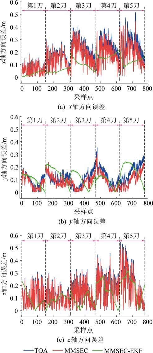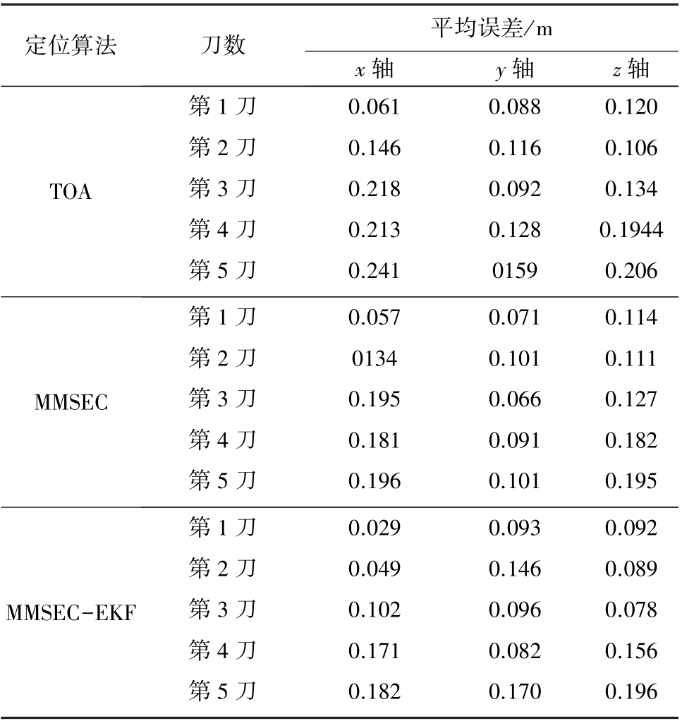定位算法 刀数 平均误差/m x 轴 y 轴 z 轴第1 刀 0.061 0.088 0.120 TOA第2 刀 0.146 0.116 0.106第3 刀 0.218 0.092 0.134第4 刀 0.213 0.128 0.1944第5 刀 0.241 0159 0.206第1 刀 0.057 0.071 0.114 MMSEC第2 刀 0134 0.101 0.111第3 刀 0.195 0.066 0.127第4 刀 0.181 0.091 0.182第5 刀 0.196 0.101 0.195第1 刀 0.029 0.093 0.092 MMSEC-EKF第2 刀 0.049 0.146 0.089第3 刀 0.102 0.096 0.078第4 刀 0.171 0.082 0.156第5 刀 0.182 0.170 0.196