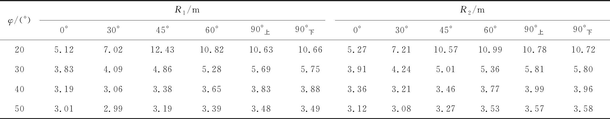 φ/(°)R1/mR2/m0°30°45°60°90°上90°下0°30°45°60°90°上90°下205.127.0212.4310.8210.6310.665.277.2110.5710.9910.7810.72303.834.094.865.285.695.753.914.245.015.365.815.80403.193.063.383.653.833.883.363.213.463.773.993.96503.012.993.193.393.483.493.123.083.273.533.573.58
