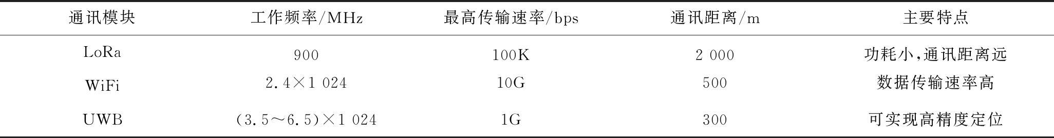 通讯模块工作频率/MHz最高传输速率/bps通讯距离/m主要特点LoRaWiFi9002.4×1 024100K10G2 000500功耗小,通讯距离远数据传输速率高UWB(3.5~6.5)×1 0241G300可实现高精度定位