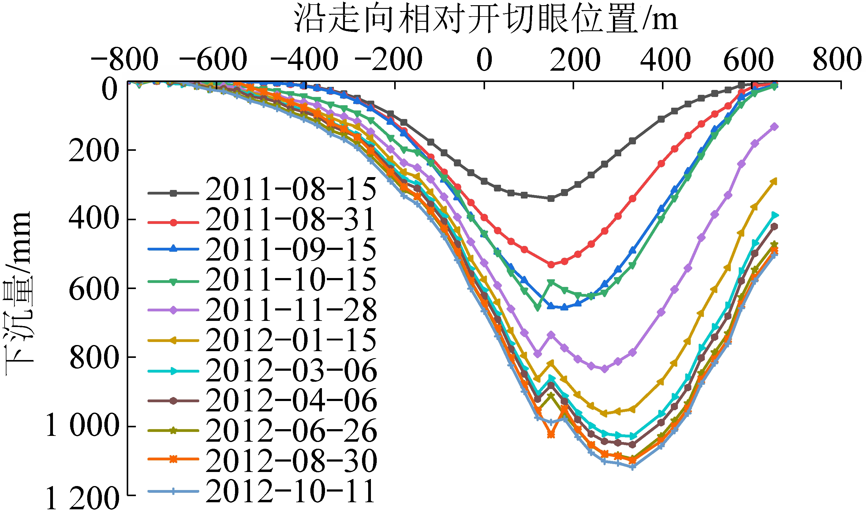 某矿1308工作面走向长度约630 m,倾向长度约230 m,主采煤层为山西组3煤层,煤层平均厚度为3 m,平均倾角为3°,为近水平煤层,煤层采用长壁垮落法开采,采深为765 m,工作面上覆松散层平均厚度为582 m,煤层顶板主要由粗砂岩、中细砂岩、砂质泥岩等组成,具有开采深度大、倾角小、松散层厚、松散层内含有多层含水层的特点。1308工作面移动盆地主断面上方采用十字线布设了地表移动观测线,走向观测线全长约1 550 m,累计布设47个观测点,倾向观测线全长约1 800 m,累计布设53个观测点,采动期间以平均35 d一次的频率进行观测,至停采后共观测12次。根据地表移动观测数据绘制了地表动态下沉曲线(图2),地表移动变形参数如下: