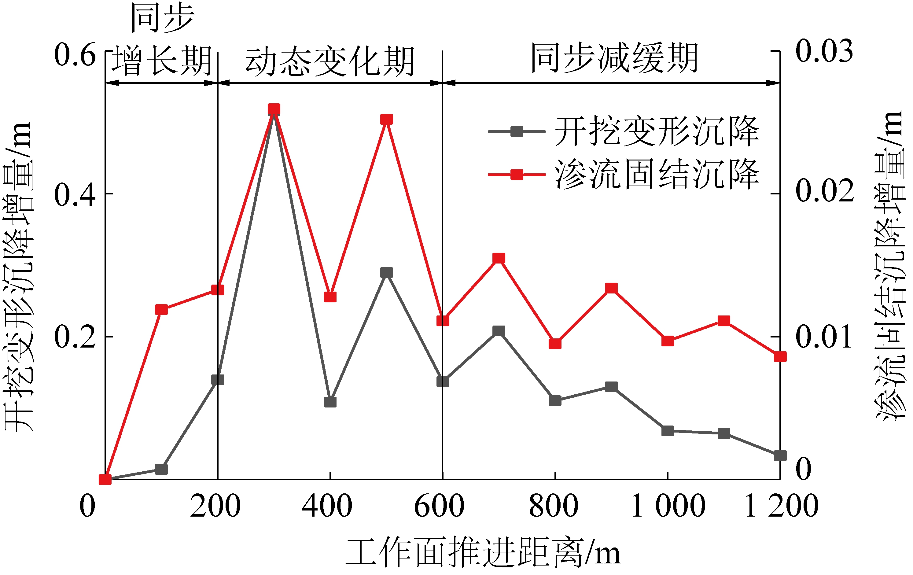 1)同步增长期。在工作面开采初期,工作面推进至200 m阶段内,开挖变形和渗流固结沉降增量呈现出同步增长的趋势,地表开始出现明显下沉,起动距约为1/4煤层埋深。