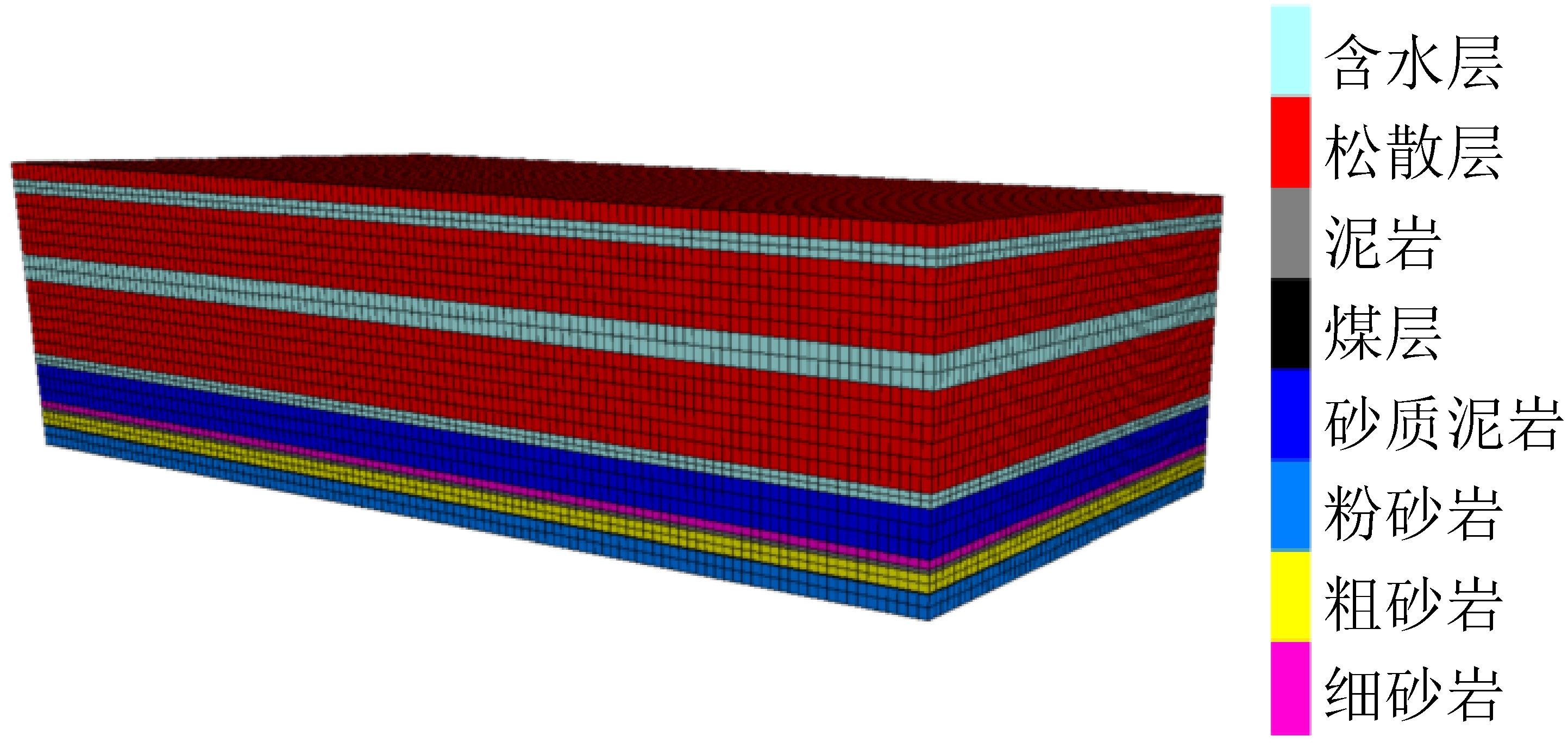 1)动态固结沉降方案。根据矿区含水、隔水层划分表(表1)在松散层内设置含水、隔水层,进行流固耦合模拟,研究巨厚含水松散层下采动过程中渗流固结沉降动态规律。