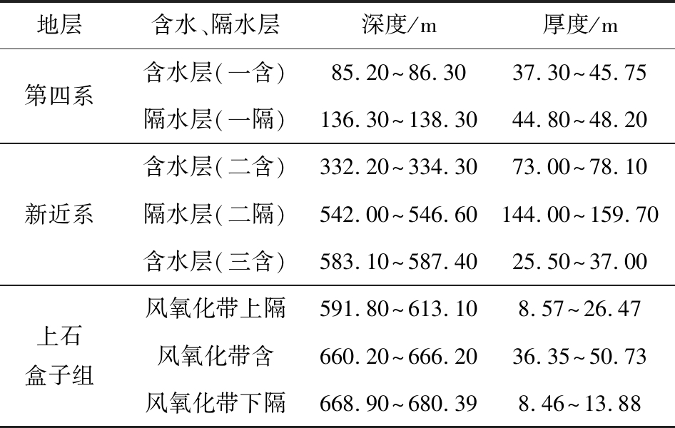 地层含水、隔水层深度/m厚度/m第四系含水层(一含)85.20~86.3037.30~45.75隔水层(一隔)136.30~138.3044.80~48.20新近系含水层(二含)332.20~334.3073.00~78.10隔水层(二隔)542.00~546.60144.00~159.70含水层(三含)583.10~587.4025.50~37.00上石盒子组风氧化带上隔591.80~613.108.57~26.47风氧化带含660.20~666.2036.35~50.73风氧化带下隔668.90~680.398.46~13.88