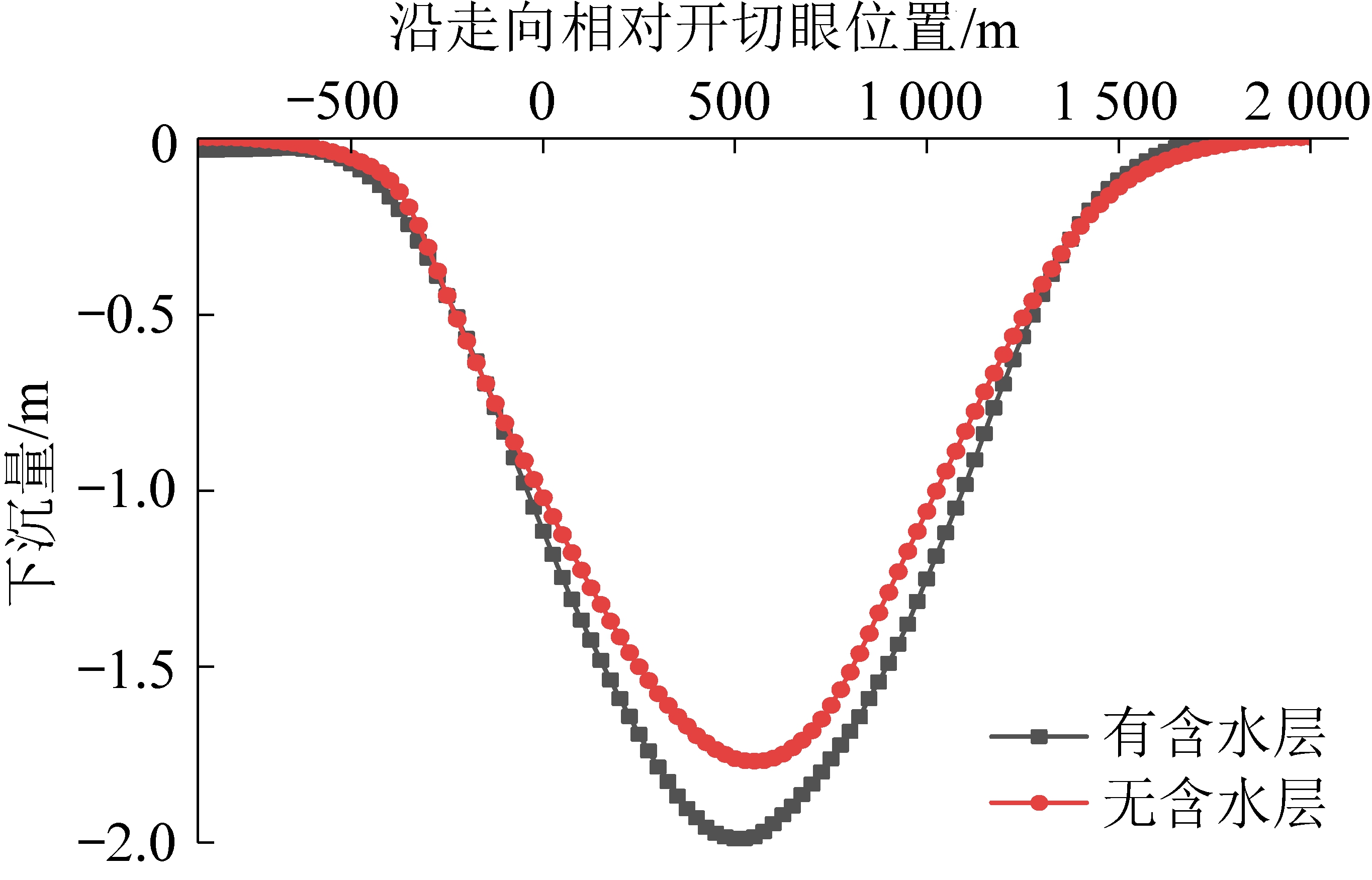 为更好地研究巨厚含水松散层的多层含水层对下沉盆地的影响,对比分析了动态固结沉降方案与无含水层方案的模拟结果,并绘制了工作面推进至1 200 m时动态固结沉降方案与无含水层方案的工作面走向下沉曲线,如图6所示。下沉曲线整体关于采空区中心对称且曲线保持连续渐变,由于工作面已推进至1 200 m,走向达到充分采动,下沉曲线底部呈现平底状,两者均符合厚松散层条件下采动引起的地表下沉曲线分布,但仍存在一定的差异性。