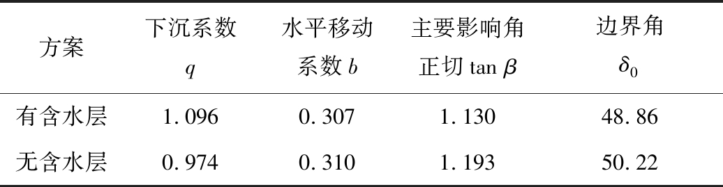 方案下沉系数q水平移动系数b主要影响角正切tan β边界角δ0有含水层1.0960.3071.13048.86无含水层0.9740.3101.19350.22