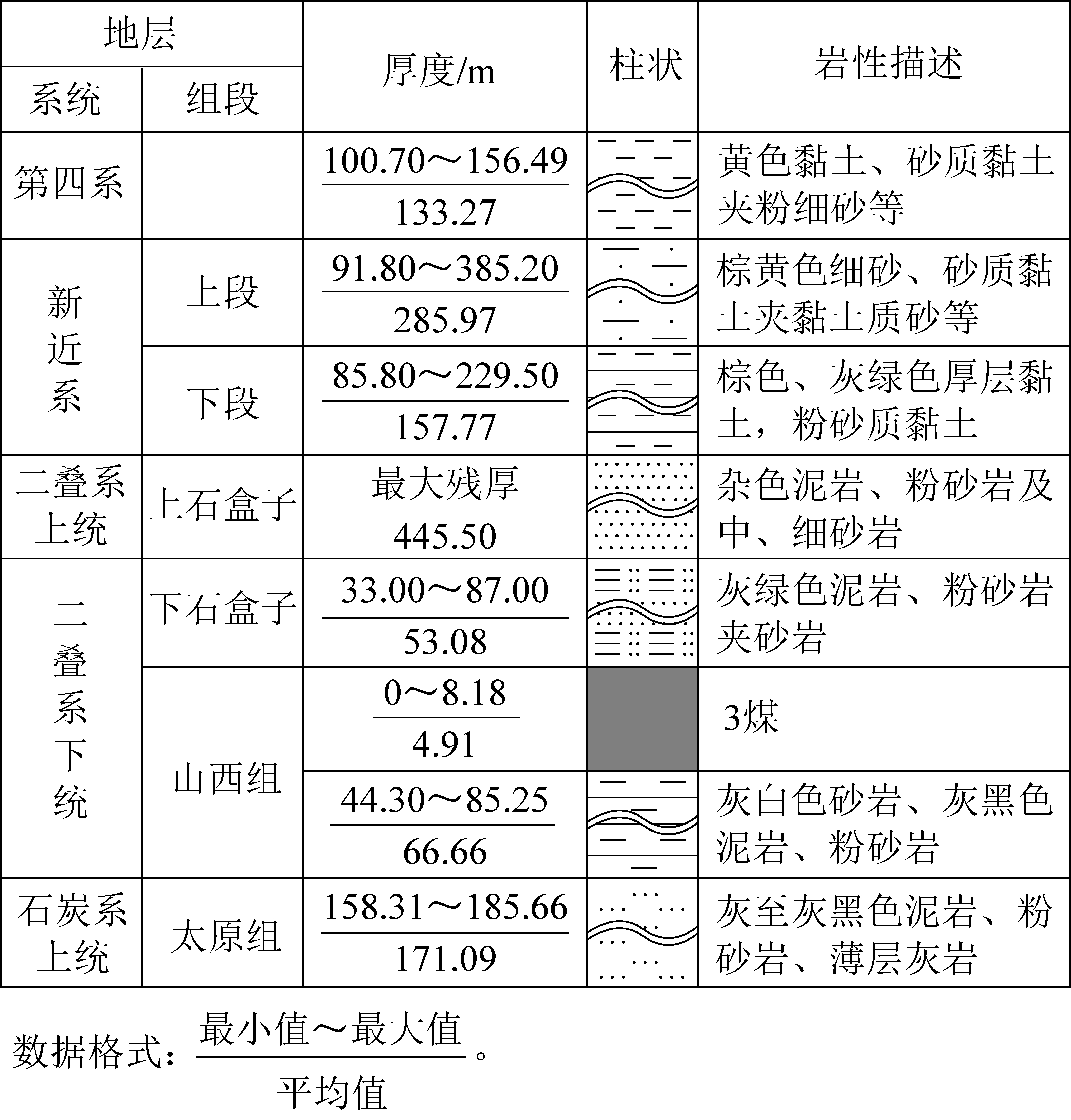 通过对钻孔柱状图以及水文地质报告分析可将上覆巨厚松散层概括划分为5层含水、隔水层,见表1。巨厚松散层内第四系含水的砂层与隔水的黏土层相间沉积,属于富水性中等的松散孔隙含水层,新近系含水的砂层单层呈犬牙交错状相连,属于富水性强的松散孔隙承压含水层。