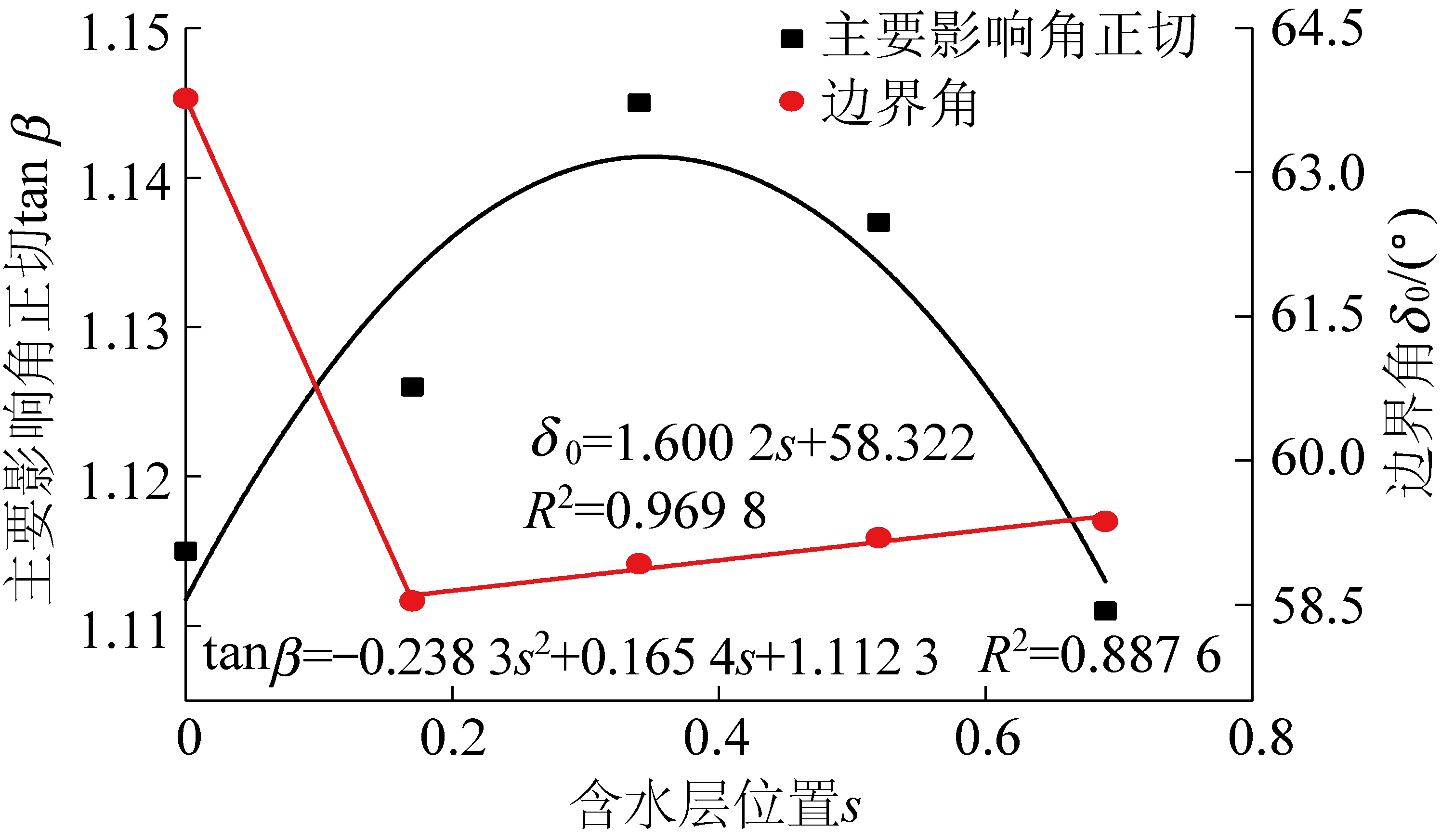 从图8可得:含水层底部与基岩之间的距离为0时,边界角为63.77°。当含水层位置与基岩不再相邻时,边界角急剧减小至58.54°,并随着含水层与基岩之间距离的增加,呈现出明显的线性增长趋势,增大至59.37°。对含水层底部与基岩间距为100~400 m的4种模拟结果的边界角与含水层位置进行相关性分析,得出边界角δ0与含水层位置s之间的相关性公式为: