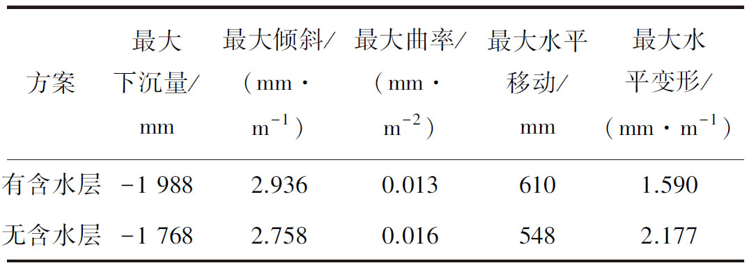 方案最大下沉量/mm最大倾斜/(mm·m-1)最大曲率/(mm·m-2)最大水平移动/mm大水平变形/(mm·m-1)有含水层-1 988 2.9360.0136101.590无含水层-1 768 2.7580.0165482.177