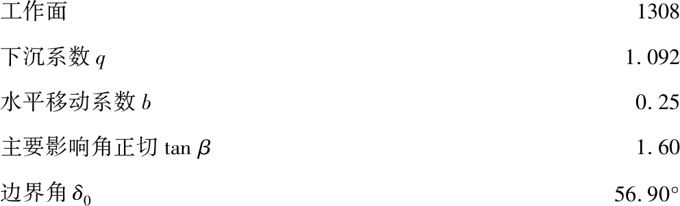 工作面1308下沉系数q1.092水平移动系数b0.25主要影响角正切tan β1.60边界角δ056.90°