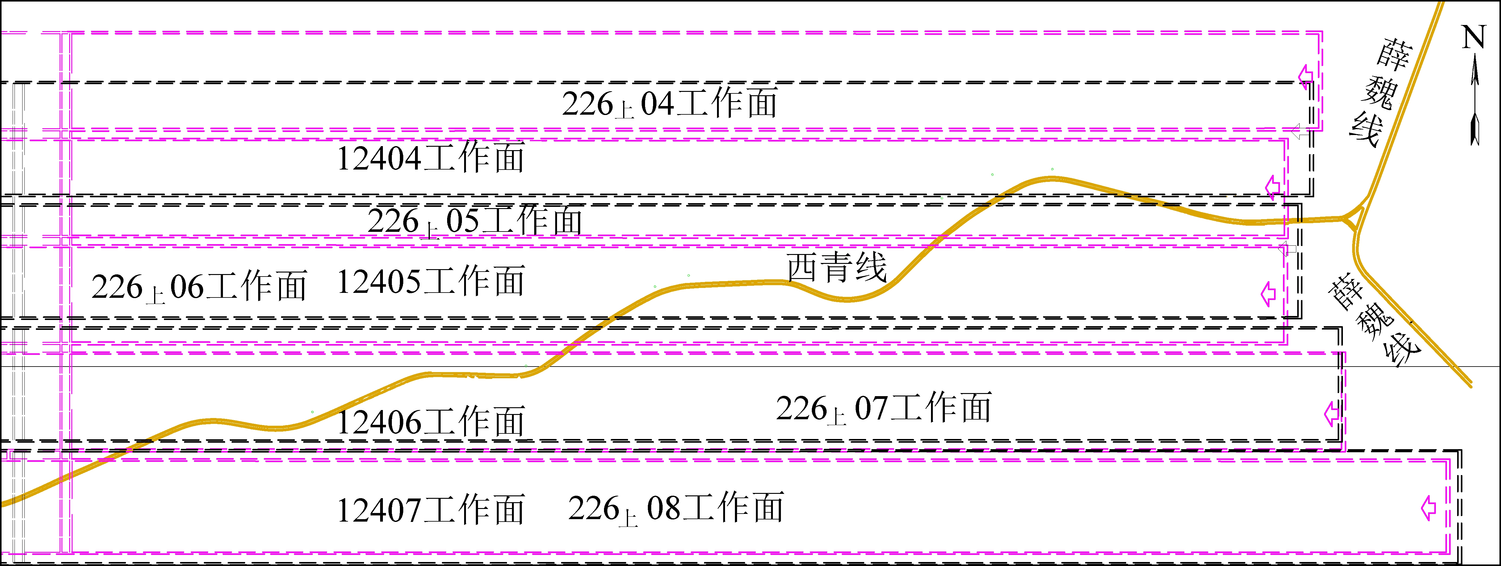 矿井分为3个盘区,其中薛魏线(省道)、西青线(县道)公路约5 200 m斜穿二盘区,根据地质采矿资料可知,二盘区4号煤12404、12405、12406与12407工作面,6上煤226上04、226上05、226上06、226上07与226上08工作面均面临公路下采煤问题(井上、井下对照如图1所示),井下煤层开采将导致公路地面的移动与变形。