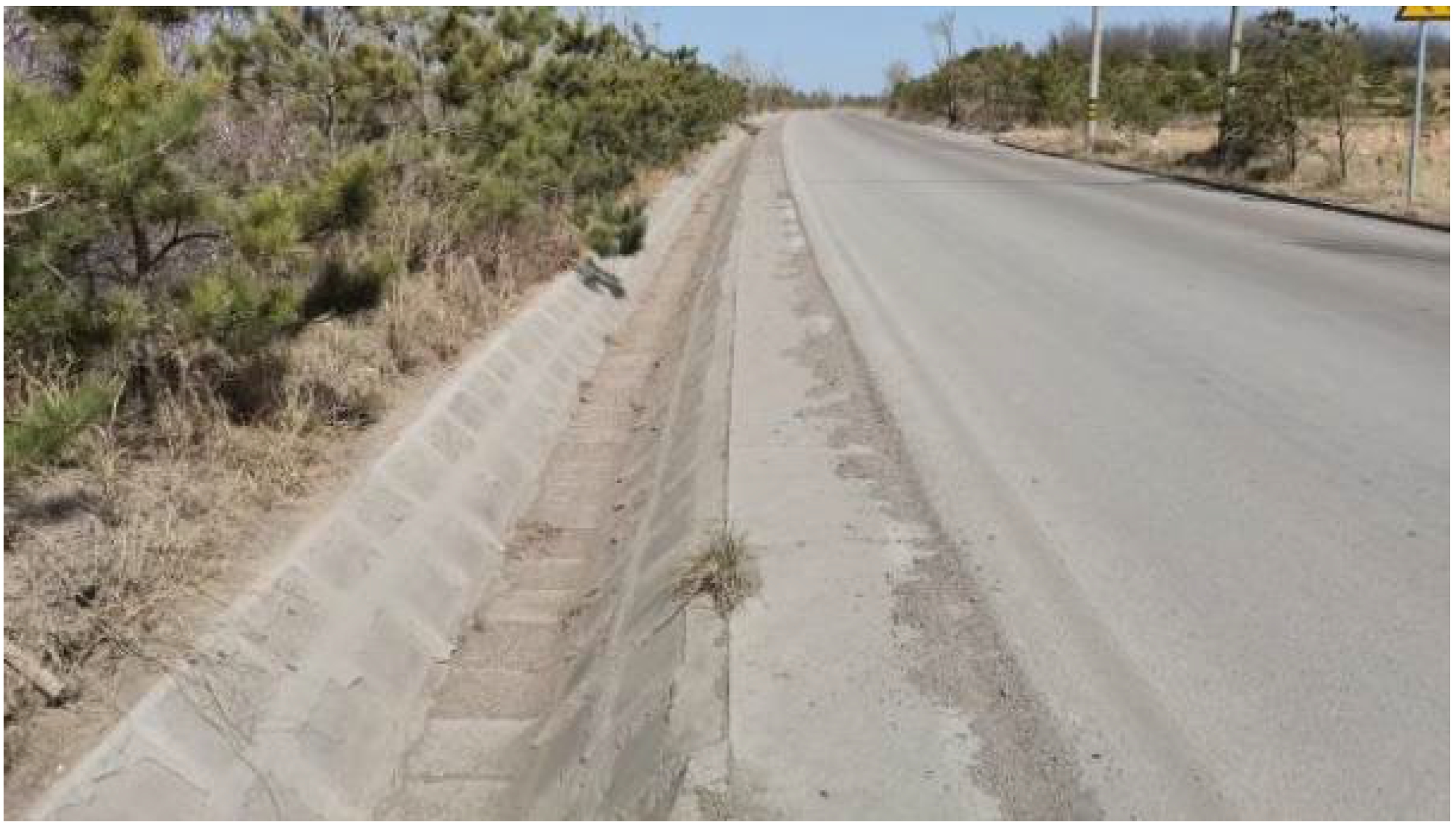 西青线西起纳榆线东至薛魏线,长度约4 km;黄玉川煤矿二盘区对应地表范围内的西青线路面宽度8.50~11.5 m(部分路段布置有排水沟),设计双向两车道,为县道,西青线路面照片如图2所示。