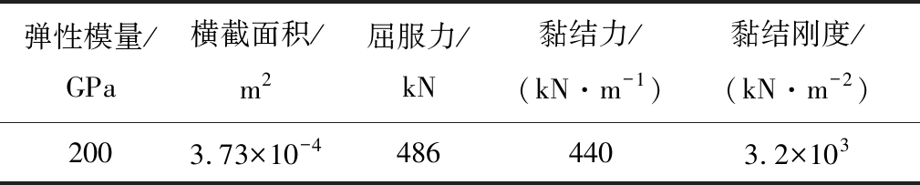 弹性模量/GPa横截面积/m2屈服力/kN黏结力/(kN·m-1)黏结刚度/(kN·m-2)2003.73×10-44864403.2×103