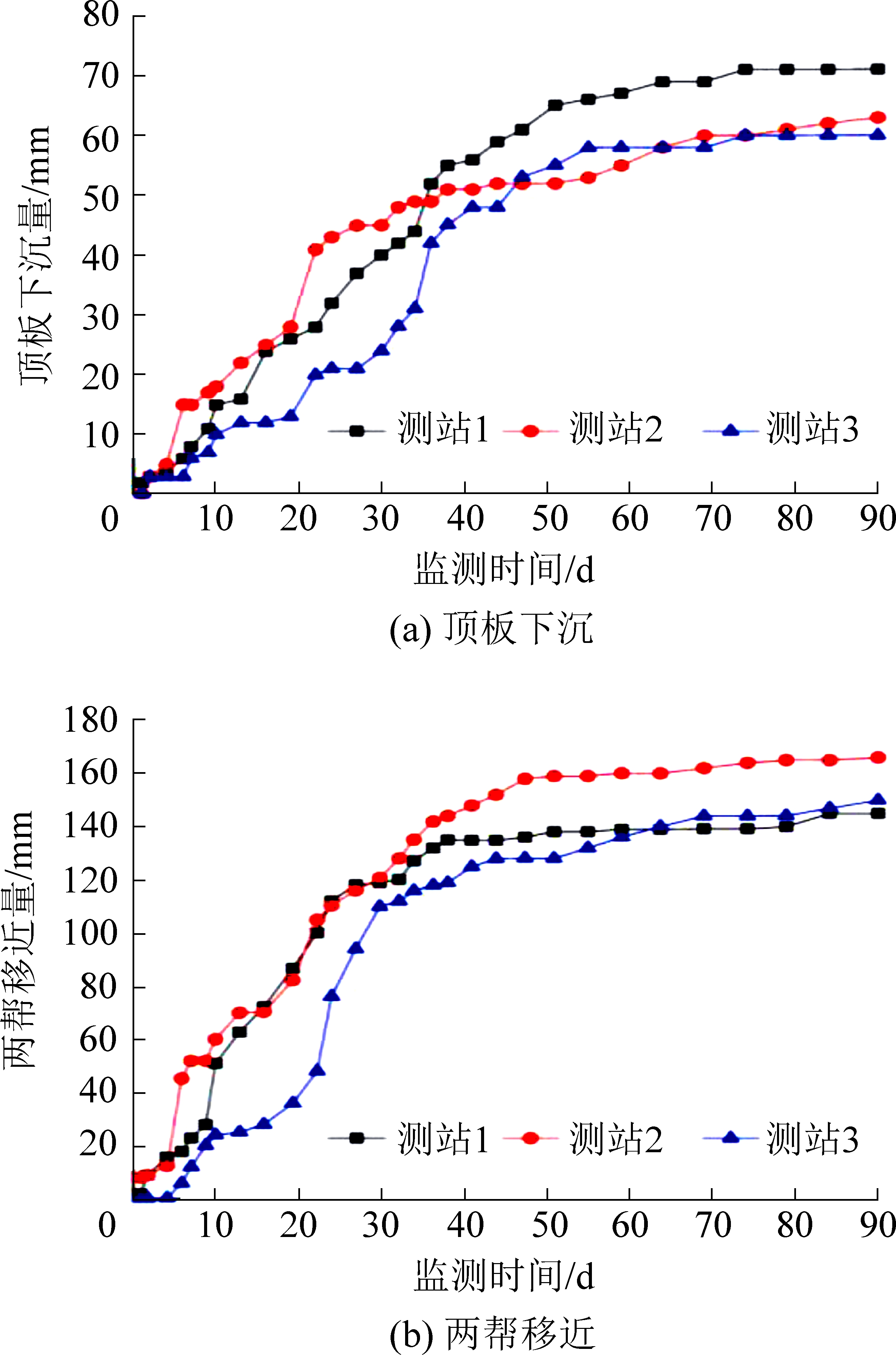巷道掘进支护完成后,布置3个测站进行为期90 d的矿压监测,主要包括巷道表面位移和锚杆锚索受力。通过对相应数据处理,可得巷道表面位移曲线和锚杆锚索受力曲线,如图11和图12所示。其中每个测站内锚杆和锚索的受力情况类似,以其中一个测站的监测结果进行说明。