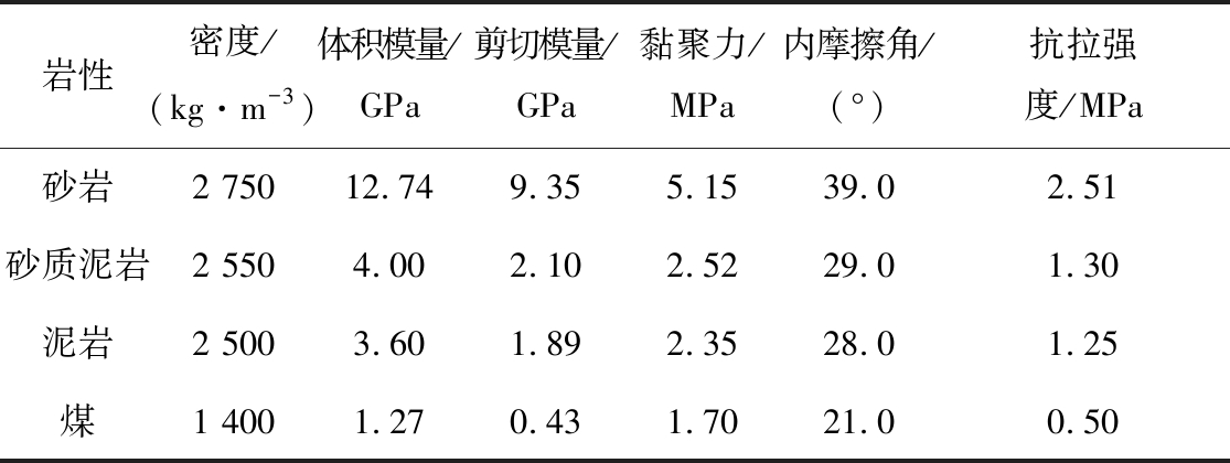 岩性密度/(kg·m-3)体积模量/GPa剪切模量/GPa黏聚力/MPa内摩擦角/(°)抗拉强度/MPa砂岩2 75012.749.355.1539.02.51砂质泥岩2 5504.002.102.5229.01.30泥岩2 5003.601.892.3528.01.25煤1 4001.270.431.7021.00.50