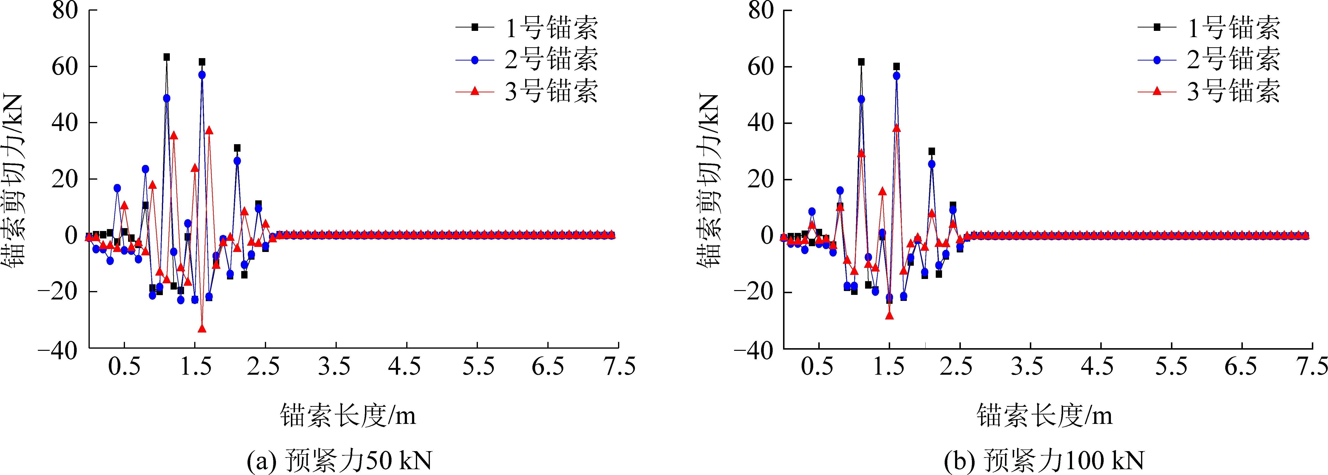 综合以上分析可知,煤矿巷道顶板锚索在下位顶板岩层内受力相对复杂,不仅受到轴向拉伸的影响,还受到横向层间剪切错动的作用,即锚索同时受到轴向拉伸荷载与横向剪切荷载,这也是现场顶板锚索破断位置多发生在顶板2.0 m范围内的主要根源。顶板锚索越靠近中部其拉伸荷载越大,而越靠近帮部其剪切荷载越显著;提高锚索的预紧力可有效控制顶板变形,有利于顶板稳定,减少锚索有害受力,降低锚索破断率,进而提高整个支护系统的稳定性和可靠性。