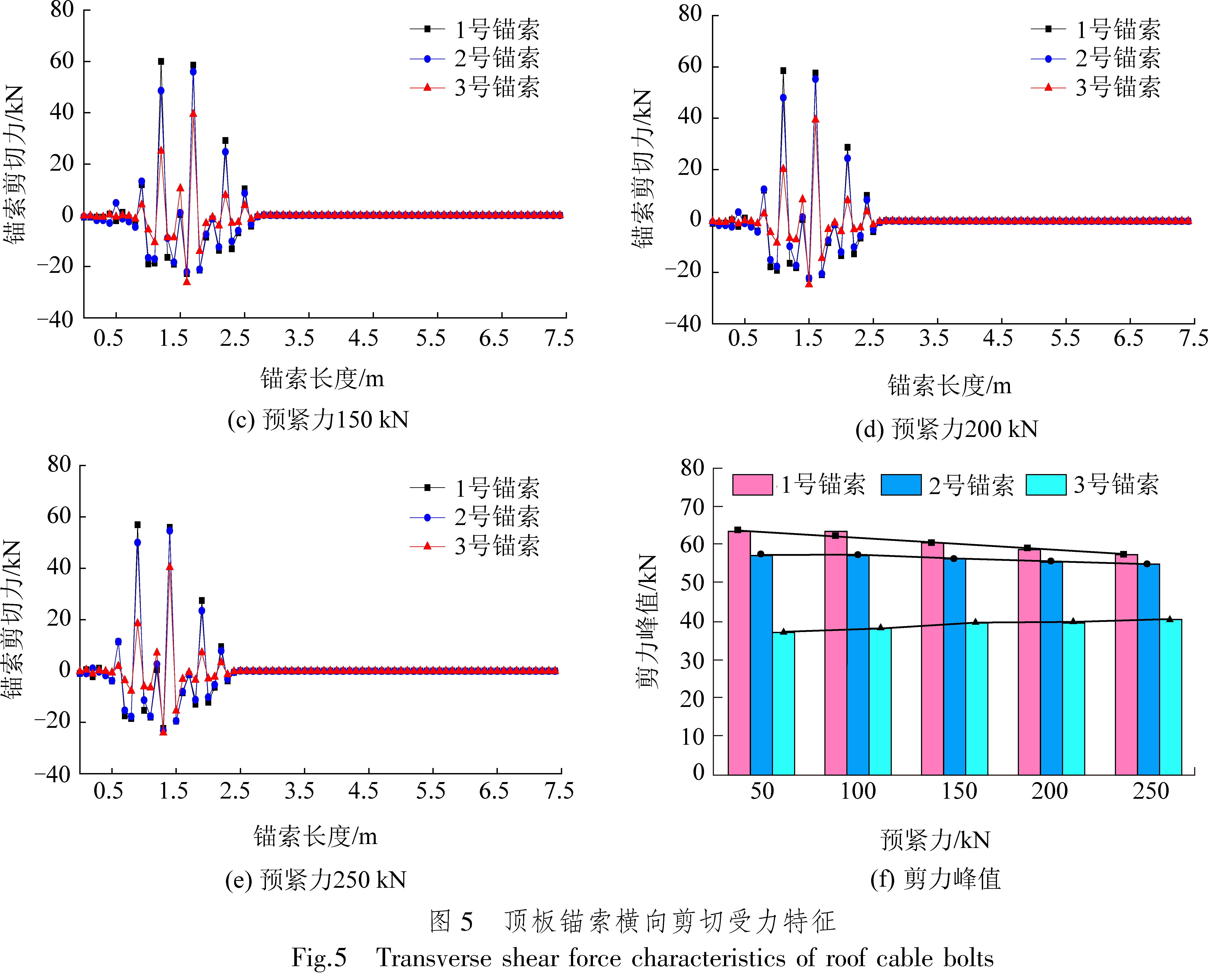 获得不同条件下锚索的横向受力结果,如图5所示。顶板2.5 m范围内锚索受到的横向剪力较为显著,剪力峰值集中在顶板深度0.5~2.0 m,顶板深度大于2.5 m后,锚索基本不受横向剪力的影响。在同一预紧力下,顶板锚索越靠近巷帮其剪力越大,而越靠近中部其剪力越小,顶板锚索的横向剪力分布特征与轴向拉力正好相反。提高锚索预紧力后,不同位置锚索的剪力峰值的差异性逐渐缩小,巷道肩角两根锚索受预紧力的影响更大,剪力峰值差异度由原来的10%减小为4%,受力趋于均匀,如图5f所示。结合巷道变形特征可知,顶板下沉过程中不仅有竖向的挠曲变形,还有横向的层间剪切错动,中部区域虽然挠曲变形最大,但其层间剪切错动不显著;而越靠近巷帮其层间错动越剧烈,导致锚索的剪力增大。锚索预紧力提高后,顶板整体位移量减小,靠近巷帮顶板的剪切错动亦较为缓和,使锚索的横向剪切受力趋于均匀。