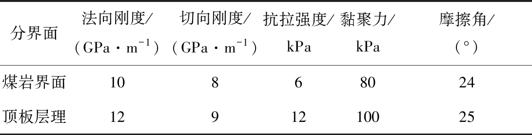 分界面法向刚度/(GPa·m-1)切向刚度/(GPa·m-1)抗拉强度/kPa黏聚力/kPa摩擦角/(°)煤岩界面10868024顶板层理1291210025