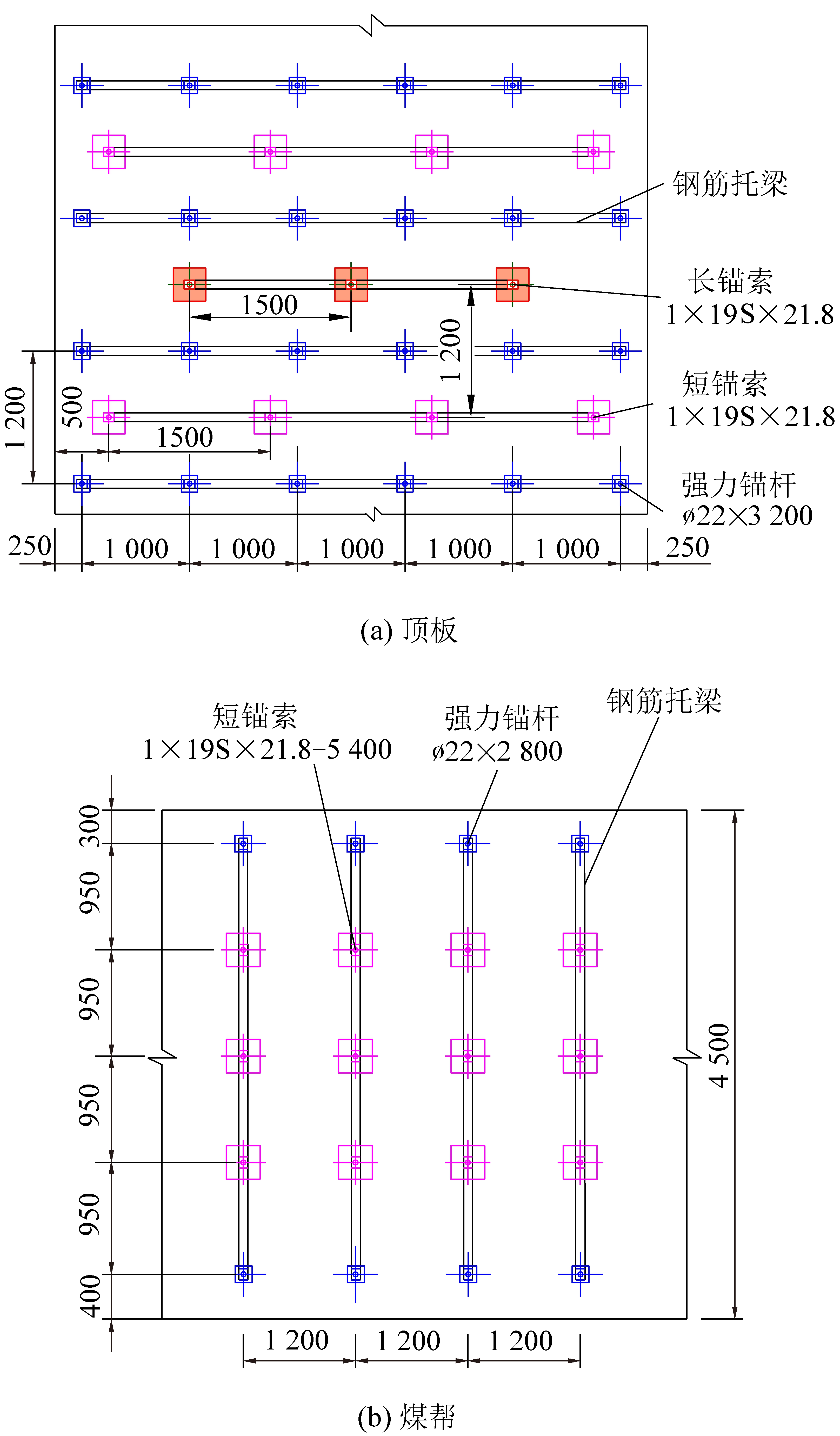 顶板采用长短锚索、长锚杆和金属网联合支护,形成3个支护层次。金属网为ø6.5 mm的钢筋焊接而成,网孔规格为100 mm×100 mm。长锚杆为高强度左旋无纵筋螺纹钢锚杆,直径为22 mm,长度为3.2 m。间排距为1 000 mm×1 200 mm,锚固长度为1 675 mm,施加预紧转矩不小于400 N·m。长短锚索均为1×19股,直径为21.8 mm的强力钢绞线,短锚索的长度为5.4 m,长锚索为7.4 m,其中短锚索每排4根,间排距为1 500 mm×2 400 mm;长锚索每排3根,间排距为1 500 mm×2 400 mm;长短锚索的锚固长度均为1 970 mm,施加预紧力不小于250 kN。