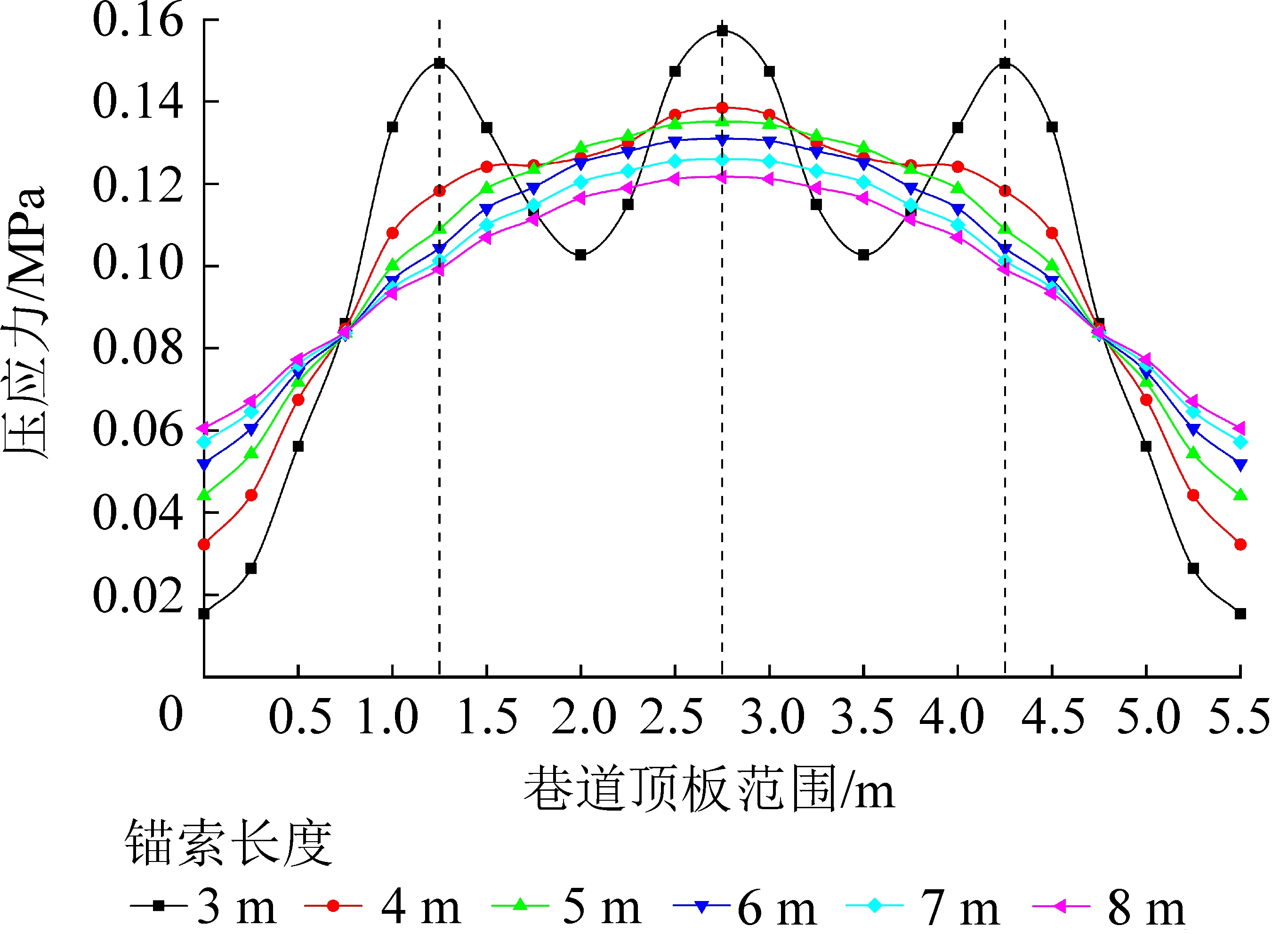 由以上结果可知,锚索的锚固段会在围岩中产生一定的拉应力,为了保障其锚固效果,应将其锚固在相对坚硬的岩层内。锚索在围岩中产生的压应力叠加主要分布在其自由段,且在托板位置会产生相对较大的压应力。随着锚索长度的增加,在顶板中产生的有效压应力范围在高度和宽度上均有所增加,说明锚索对围岩的主动支护范围越来越大。当锚索长度不小于4 m时,随着锚索长度的增加,对其自由段中部围岩的压应力叠加程度逐渐降低,说明锚索长度增加后对其锚固范围内围岩的支护刚度有降低趋势;而锚索长度为3 m时,虽然单根锚索能够产生较大的压应力,但其长度有限,群体支护时预应力在横向范围内压应力叠加效应不显著,在其自由段中部围岩的压应力呈波浪型分布。