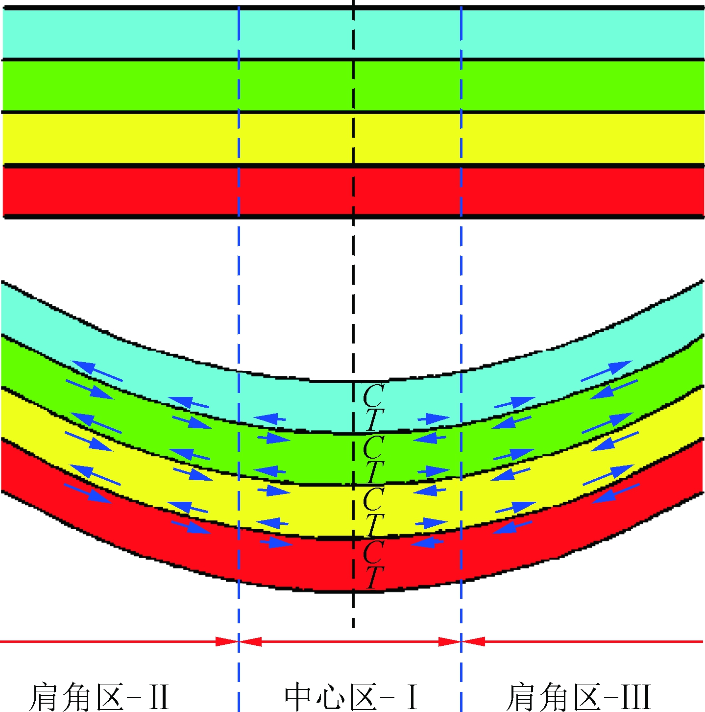 图8 层状顶板岩梁“横三区”挠曲变形示意