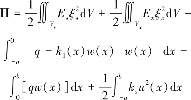 式中:Vs为上岩层积分区域;Vx为下岩层积分区域;Es与Ex为双层复合岩梁上下岩层弹性模量,Pa;ξs为双层复合岩梁上岩层总应变;ξx为双层复合岩梁下岩层总应变,表达式为: