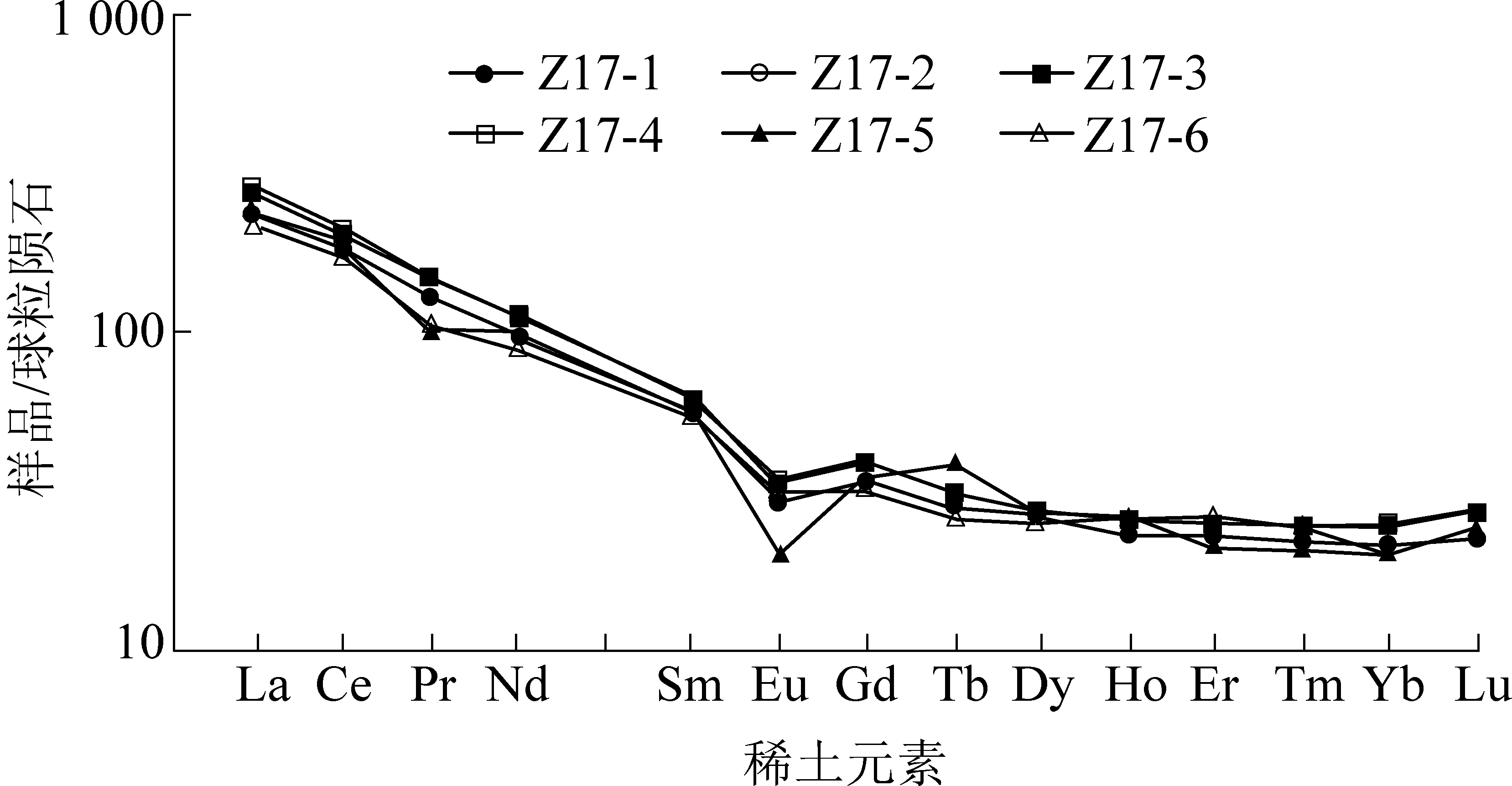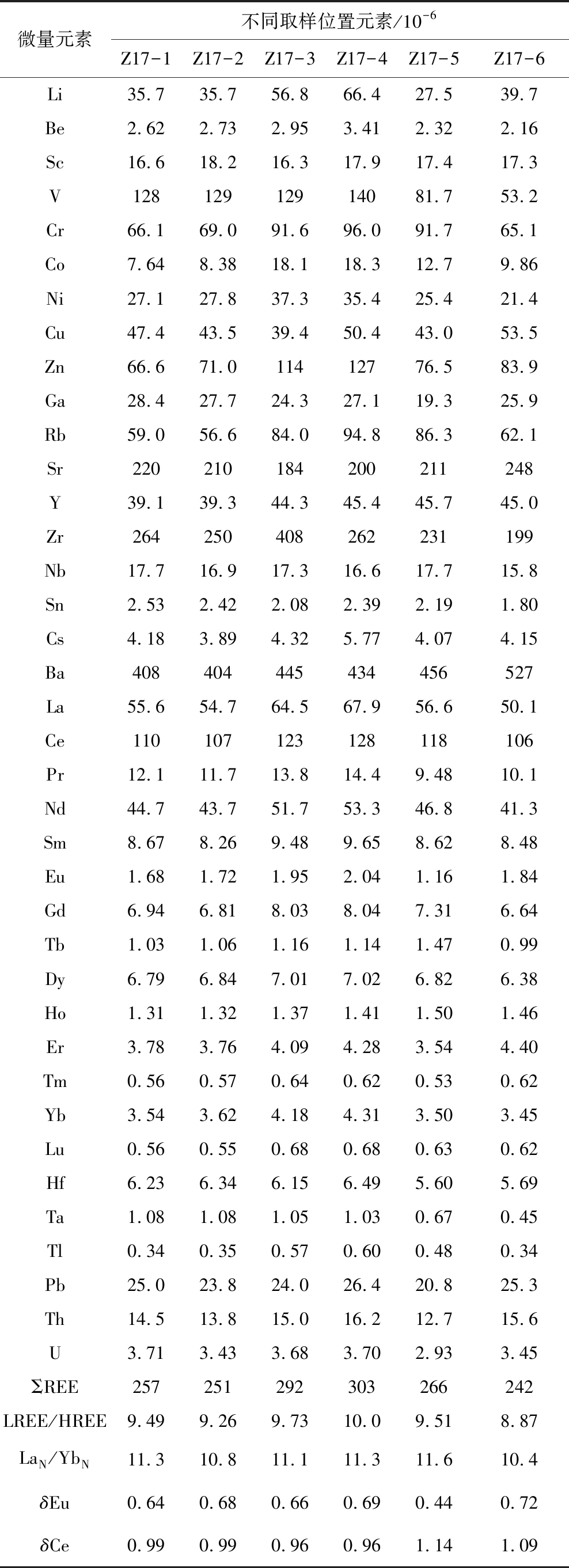 微量元素不同取样位置元素/10-6Z17-1Z17-2Z17-3Z17-4Z17-5Z17-6Li35.735.756.866.427.539.7Be2.622.732.953.412.322.16Sc16.618.216.317.917.417.3V12812912914081.753.2Cr66.169.091.696.091.765.1Co7.648.3818.118.312.79.86Ni27.127.837.335.425.421.4Cu47.443.539.450.443.053.5Zn66.671.011412776.583.9Ga28.427.724.327.119.325.9Rb59.056.684.094.886.362.1Sr220210184200211248Y39.139.344.345.445.745.0Zr264250408262231199Nb17.716.917.316.617.715.8Sn2.532.422.082.392.191.80Cs4.183.894.325.774.074.15Ba408404445434456527La55.654.764.567.956.650.1Ce110107123128118106Pr12.111.713.814.49.4810.1Nd44.743.751.753.346.841.3Sm8.678.269.489.658.628.48Eu1.681.721.952.041.161.84Gd6.946.818.038.047.316.64Tb1.031.061.161.141.470.99Dy6.796.847.017.026.826.38Ho1.311.321.371.411.501.46Er3.783.764.094.283.544.40Tm0.560.570.640.620.530.62Yb3.543.624.184.313.503.45Lu0.560.550.680.680.630.62Hf6.236.346.156.495.605.69Ta1.081.081.051.030.670.45Tl0.340.350.570.600.480.34Pb25.023.824.026.420.825.3Th14.513.815.016.212.715.6U3.713.433.683.702.933.45ΣREE257251292303266242LREE/HREE9.499.269.7310.09.518.87LaN/YbN11.310.811.111.311.610.4δEu0.640.680.660.690.440.72δCe0.990.990.960.961.141.09