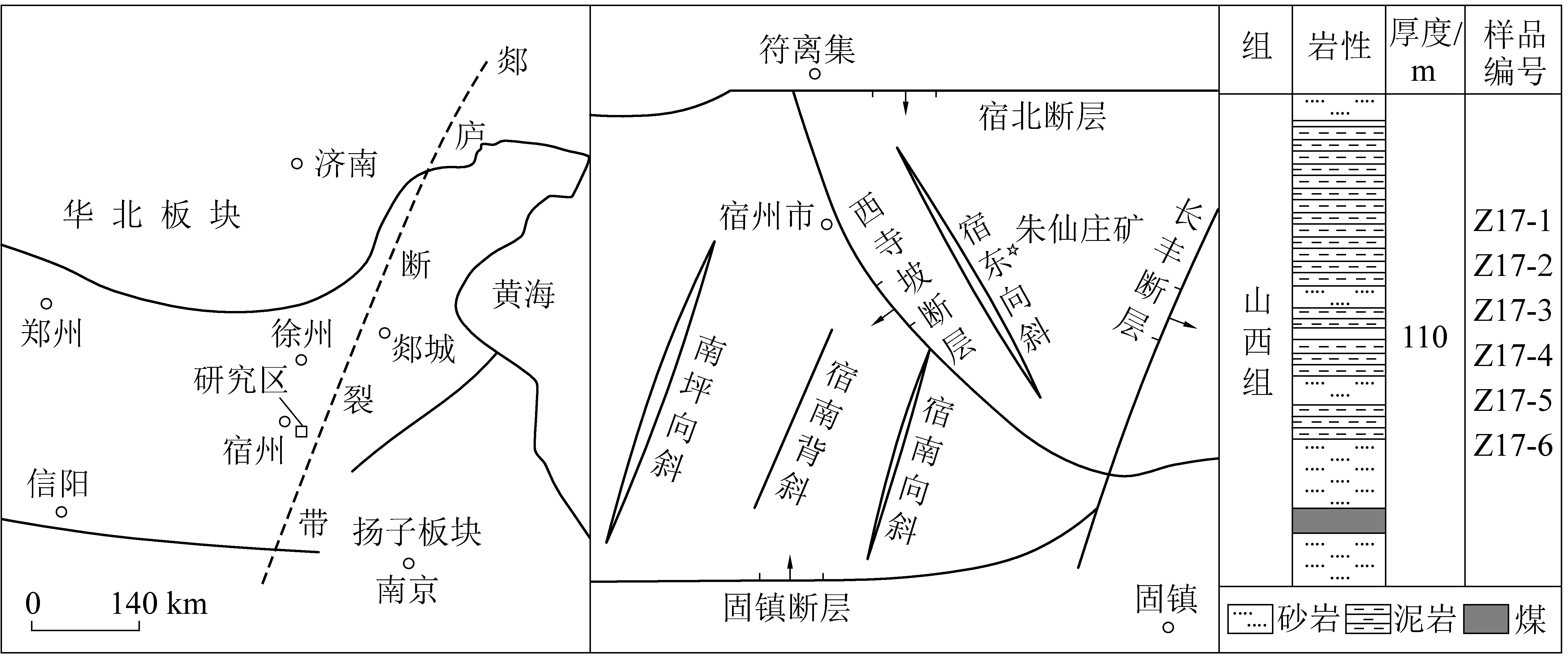 沉积物中元素的地球化学行为不仅和自身元素性质有关,还受到搬运、沉积等外部条件的影响,因此沉积物中元素地球化学特征能够反映古地理环境特征[1]。泥质岩等细粒碎屑岩化学成分接近源岩,相对于其他沉积岩,更容易受到物源、构造演化、沉积环境等因素的影响。因此,通过对泥质岩中元素地球化学特征的研究,对探讨泥质岩物质来源及演化、沉积盆地古环境特征具有一定意义[2-3]。淮北煤田宿州矿区煤炭资源丰富,二叠纪山西组是该地区主要含煤地层。前人对该地区山西组地质特征进行了大量研究。李运山等[4]通过层序地层学对芦岭井田山西组沉积环境进行探讨,宋立军等[5]运用沉积学知识对研究区二叠纪沉积环境及聚煤规律进行了分析,魏尔林等[6]对朱仙庄井田二叠纪含煤岩系垂直层序特征进行了详细研究,取得一致认识:二叠纪山西组沉积环境为河控三角洲。然而,缺少元素地球化学方面的证据。而且这些研究主要侧重于沉积环境方面,缺少对物源及源区构造背景方面的研究。淮北煤田和淮南煤田同位于徐淮地块,属徐淮二级赋煤带。淮北煤田山西组地层岩石元素地球化学特征相关研究较少,但邻区淮南煤田进行了一些研究。范翔[7]在对淮南二叠纪含煤地层泥质岩地球化学特征研究时,通过一些图解将山西组样品分别投落在石英质沉积岩源区及被动大陆边缘并靠近活动大陆边缘的区域;高德燚[8]在对淮南地区煤系地层微量元素地球化学进行研究时,认为山西组物源为长英质岩石,构造背景为大陆岛弧。山西组物源及构造背景在认识上存在一些争议。而淮北煤田与淮南煤田在二叠纪时期物源及构造背景较为相似[9]。