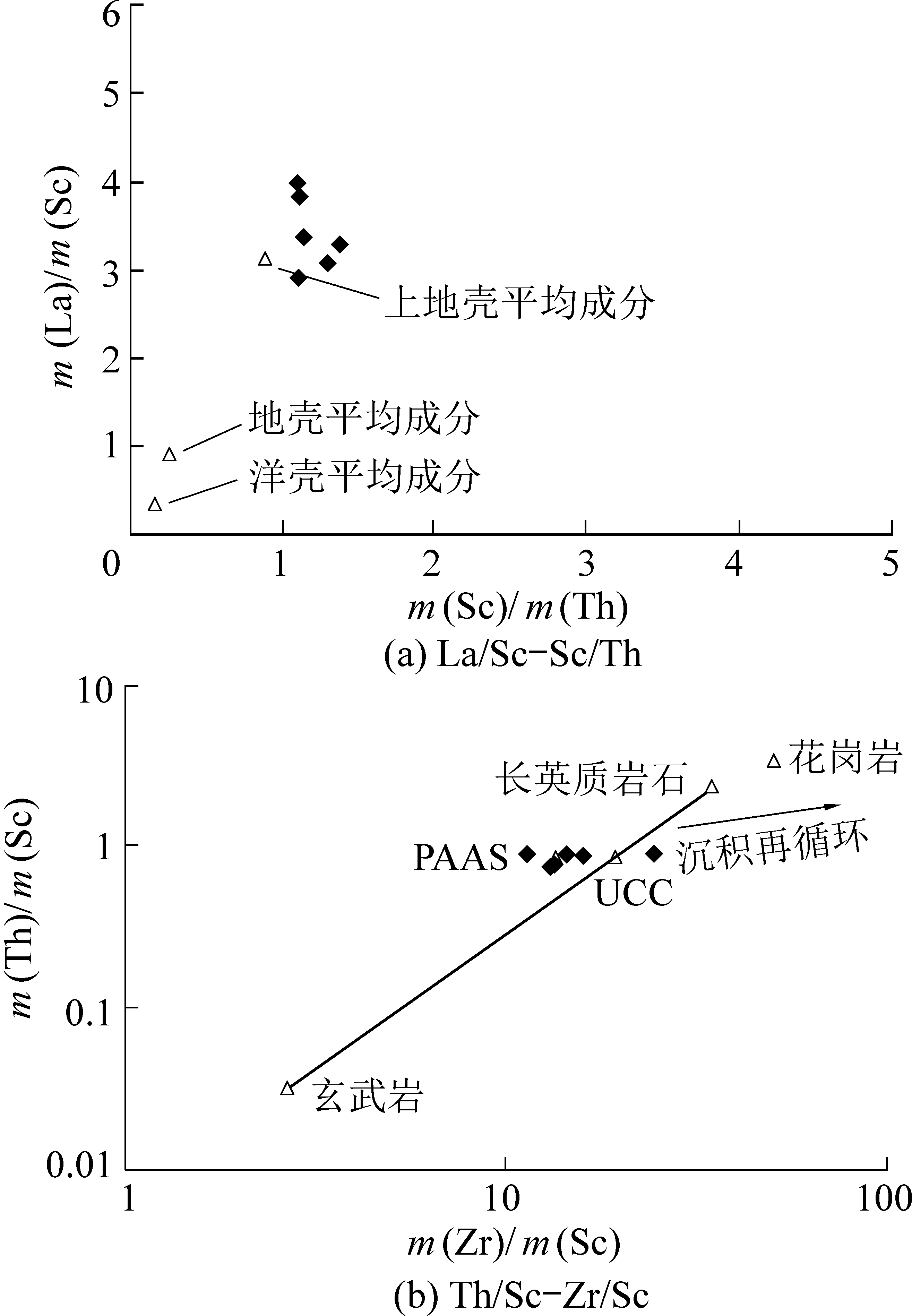 因为泥质岩均质性较好以及渗透性较低,在物源分析中是最常用的碎屑岩类型。淮北煤田宿州矿区煤系泥质岩m(Th)/m(Sc)值分布范围为0.73~0.92,平均值为0.85,比中国东部地壳界限值(0.6)高[13],接近上地壳值(0.97)[14],在Th/Sc-Zr/Sc图解(图4b)上投落于上地壳附近,反映来源于上地壳源区。