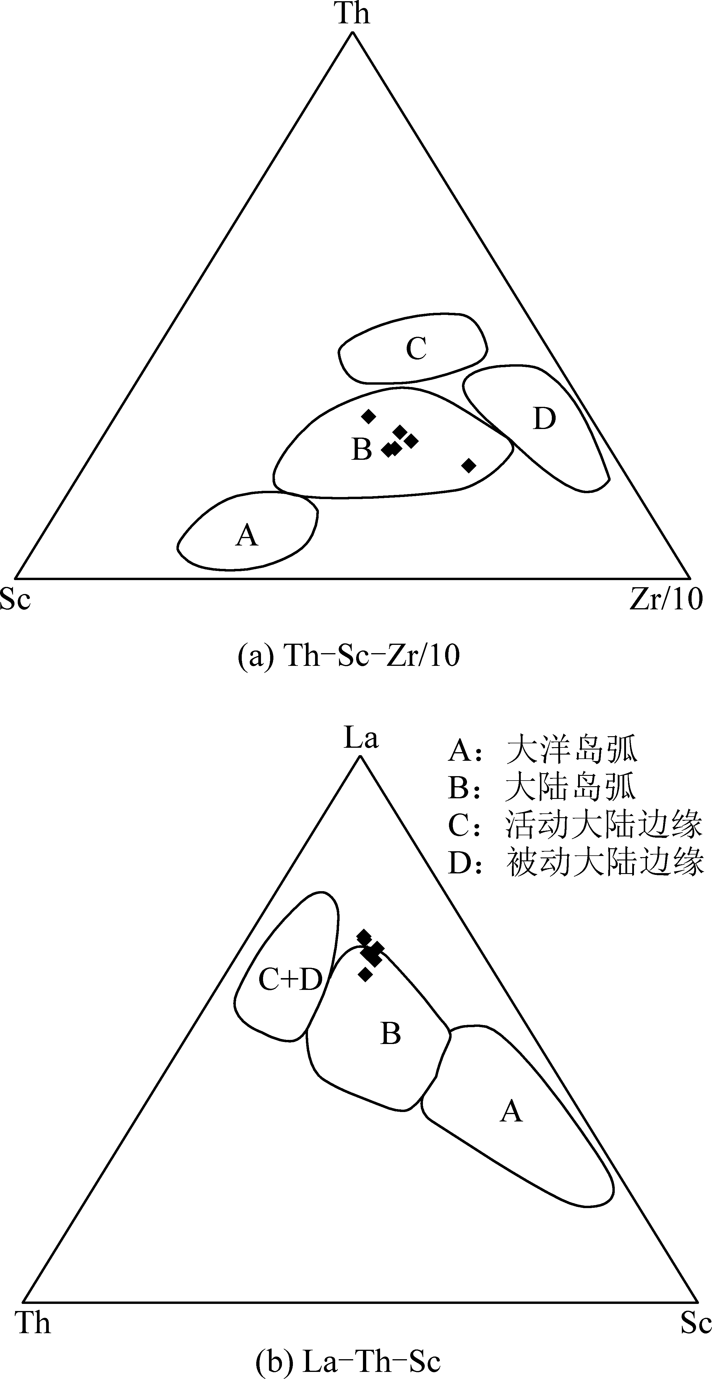 3)从Th-Sc-Zr/10和La-Th-Sc构造环境判别图可知,研究区泥质岩源岩构造背景为大陆岛弧。