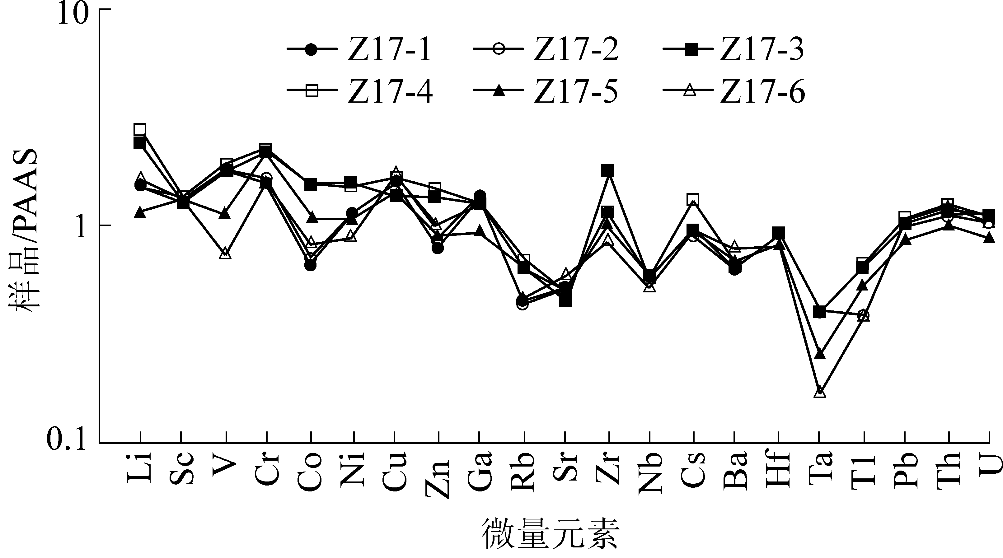 微量元素分析结果(表2)显示,元素Ba质量分数较高,平均为378.69×10-6;Zr质量分数平均为268.97×10-6;Sr质量分数平均为212.02×10-6;V质量分数平均为110.05×10-6。除此之外其他元素质量分数均小于100×10-6。在蛛网图(图2,样品中元素质量分数与PAAS中元素分数之比)上可以看出元素分配差异较为明显。Li、Sc、Cr、Cu、Ga、Zr、Cs、Th等元素富集,Ba、Ta、Rb、Sr、Nb等元素亏损。富集的元素可能是泥质岩中黏土矿物的吸附作用或离子交换作用及有机质的存在导致。