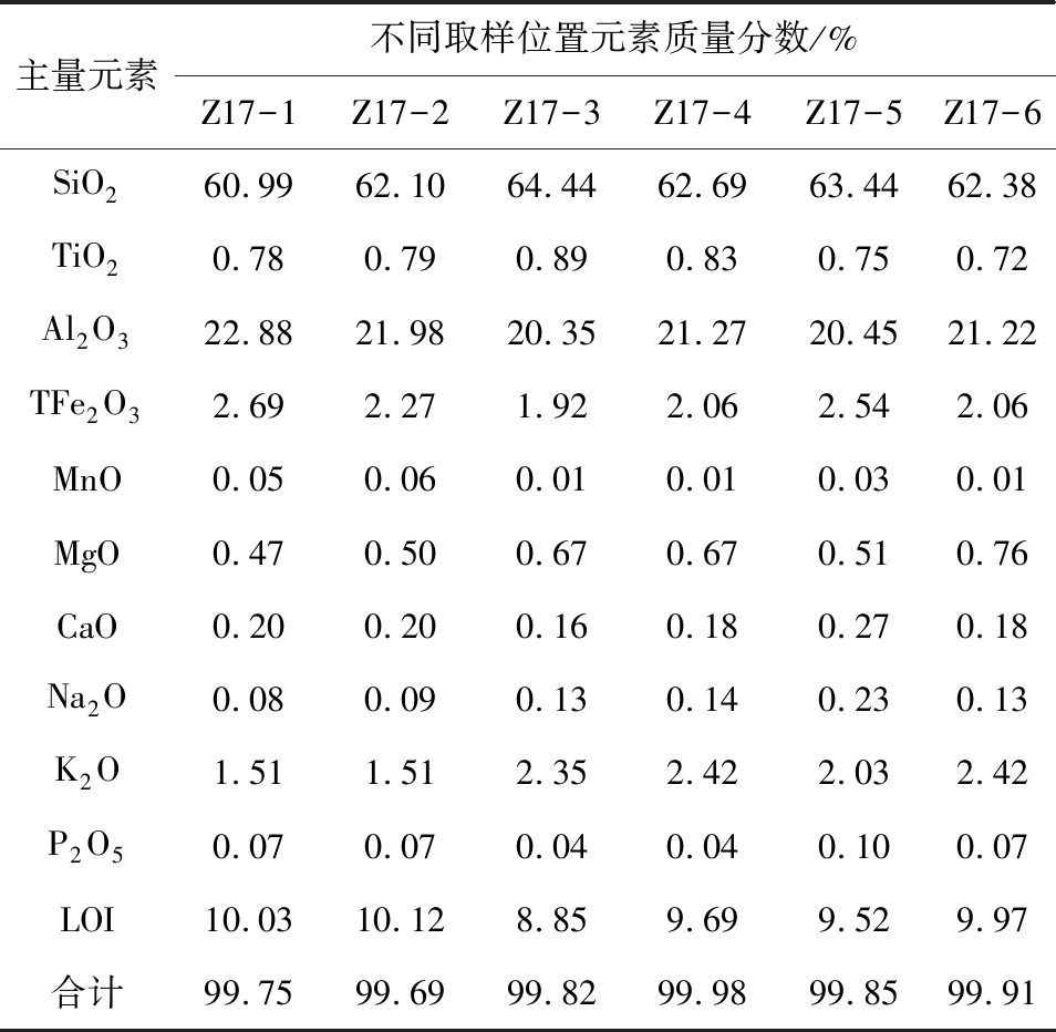 主量元素不同取样位置元素质量分数/%Z17-1Z17-2Z17-3Z17-4Z17-5Z17-6SiO260.9962.1064.4462.6963.4462.38TiO20.780.790.890.830.750.72Al2O322.8821.9820.3521.2720.4521.22TFe2O32.692.271.922.062.542.06MnO0.050.060.010.010.030.01MgO0.470.500.670.670.510.76CaO0.200.200.160.180.270.18Na2O0.080.090.130.140.230.13K2O1.511.512.352.422.032.42P2O50.070.070.040.040.100.07LOI10.0310.128.859.699.529.97合计99.7599.6999.8299.9899.8599.91