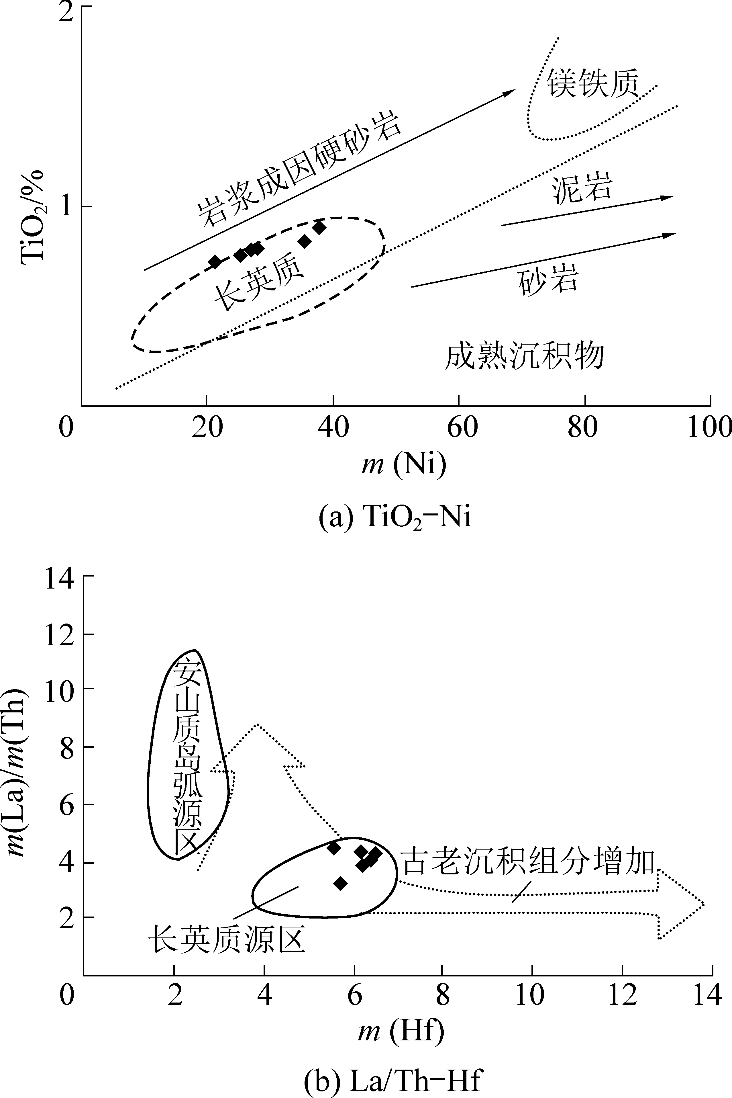 淮北煤田宿州矿区山西组泥质岩中m(Al2O3)/m(TiO2)值为22.77~29.47(平均为27.08),而长英质岩石的m(Al2O3)/m(TiO2)值通常介于19~28[15]。m(Cr)/m(Zr)比值能够反映沉积物主要来自铁镁质组分还是来自长英质组分[16],研究区山西组泥质岩m(Cr)/m(Zr)值为0.22~0.40(平均为0.31)。无论m(Al2O3)/m(TiO2)还是m(Cr)/m(Zr)比值均暗示研究区泥页岩物源是以长英质组分为主。泥质岩Ni质量分数为21.44×10-6~37.3×10-6,平均为29.07×10-6,在TiO2-Ni图解(图5a)上,样品均落在长英质区域附近。Hf质量分数为5.6×10-6~6.49×10-6,m(La)/m(Th)值在3.2~4.45。在La/Th-Hf图解上(图5b),样品全分布在长英质源区。
