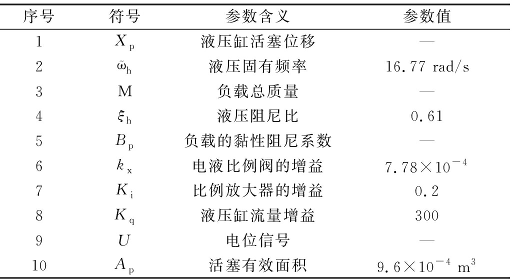 序号符号参数含义参数值1Xp液压缸活塞位移—2h液压固有频率16.77 rad/s3M负载总质量—4ξh液压阻尼比0.615Bp负载的黏性阻尼系数—6kx电液比例阀的增益7.78×10-47Ki比例放大器的增益0.28Kq液压缸流量增益3009U电位信号—10Ap活塞有效面积9.6×10-4 m3