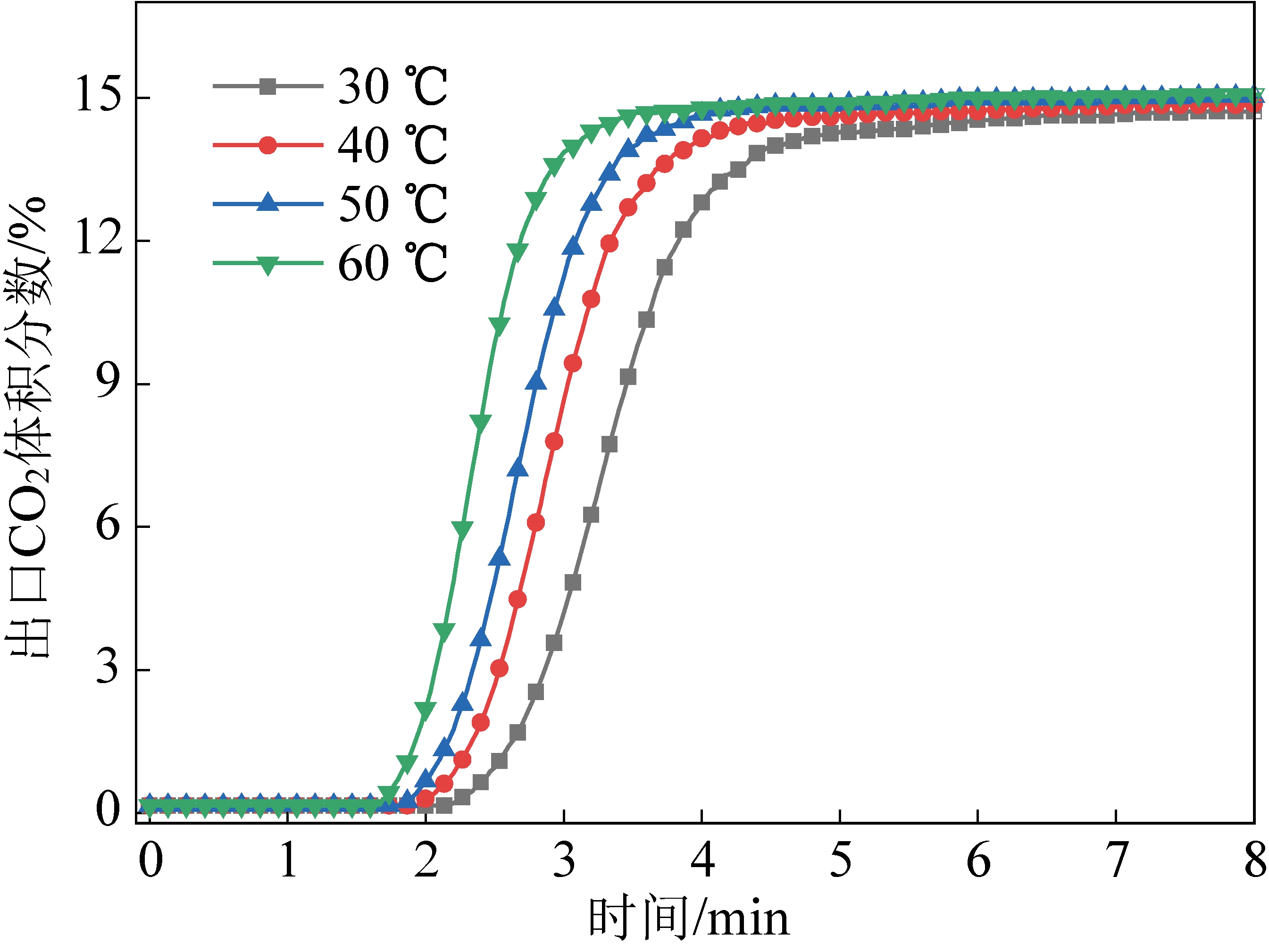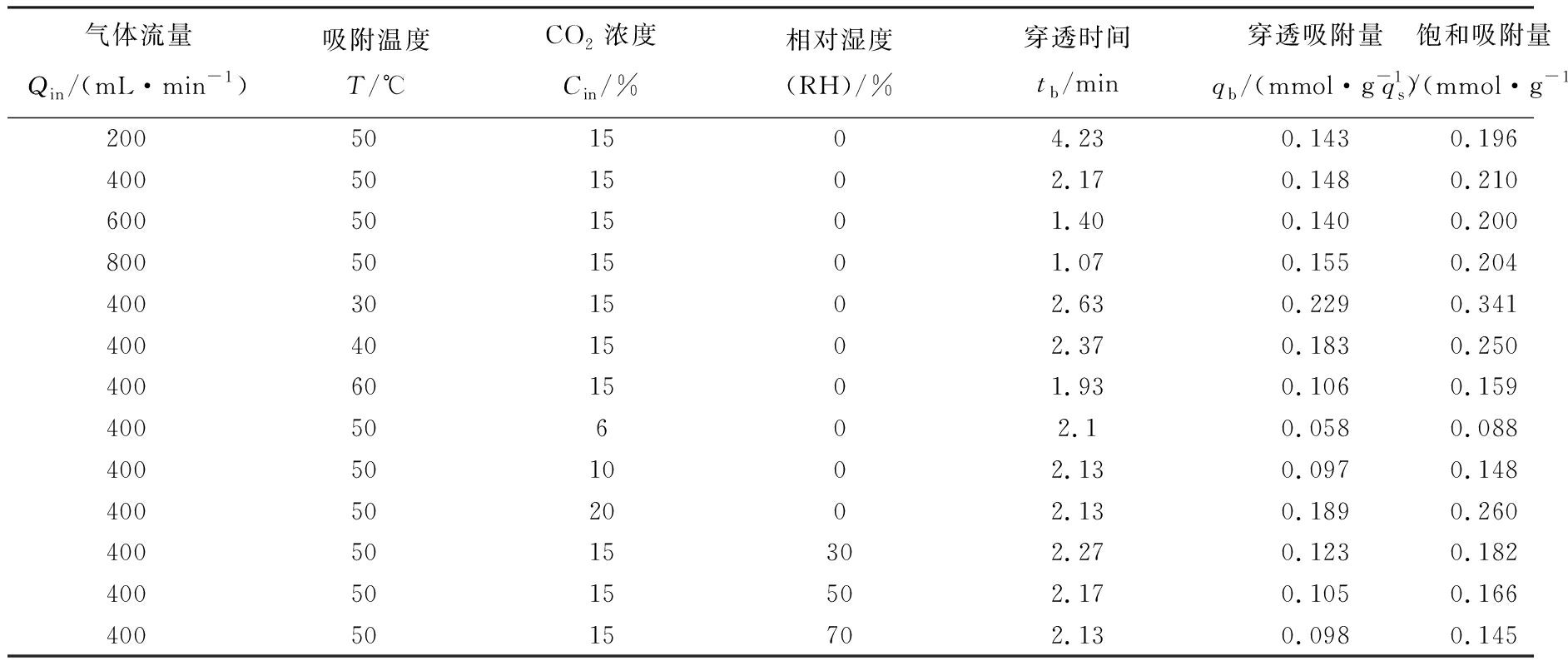 式中:Q为吸附剂的CO2吸附量,mmol/g;Qin为固定床入口气体流量,mL/min;m为吸附剂的质量,g;Vm为气体摩尔体积,L/mol;Cin为固定床入口CO2体积分数,%;Cout为吸附床出口CO2体积分数,%;t为吸附时间,min。