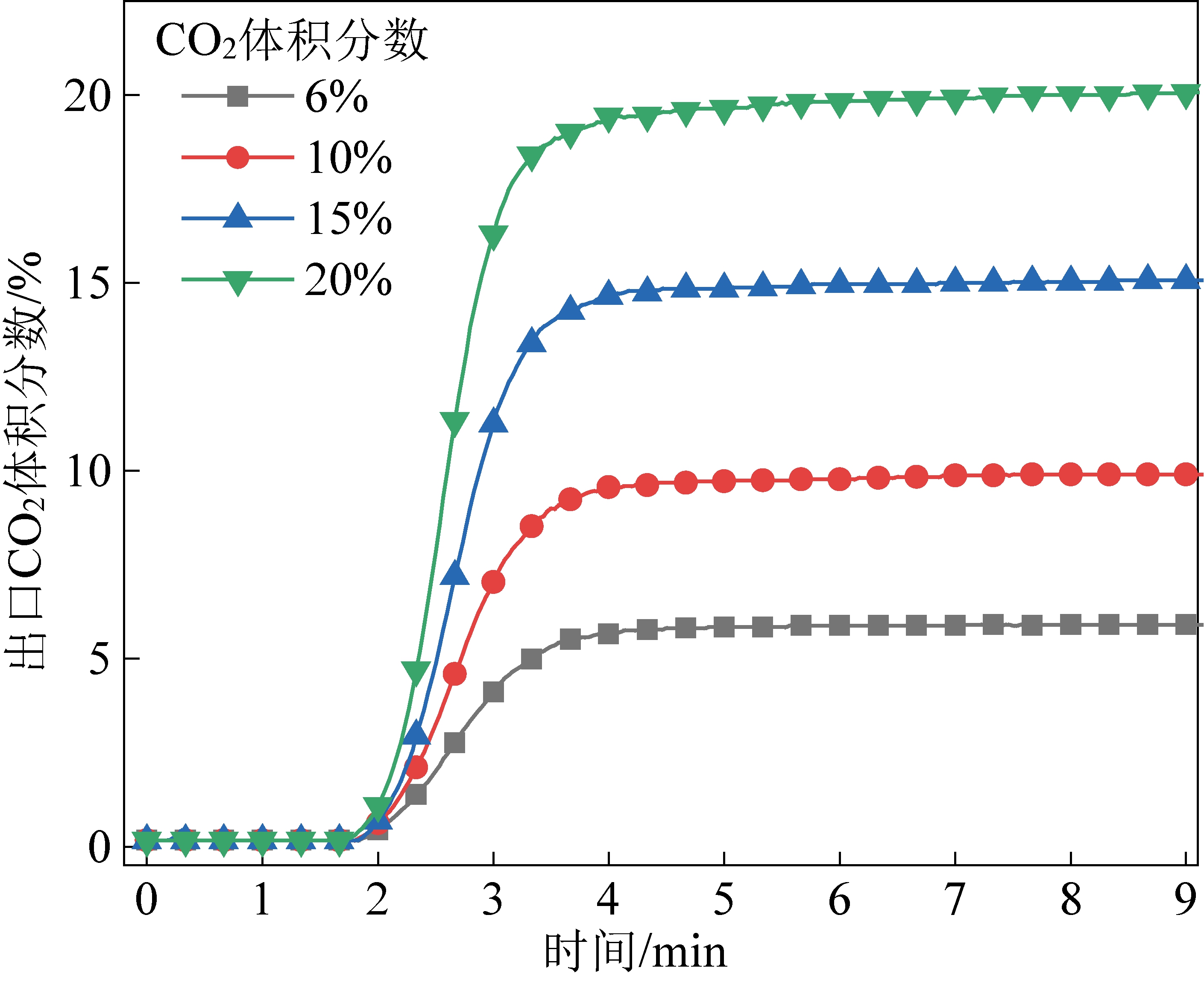 Fig.8 CO2 breakthrough curves at different CO2 concentrations