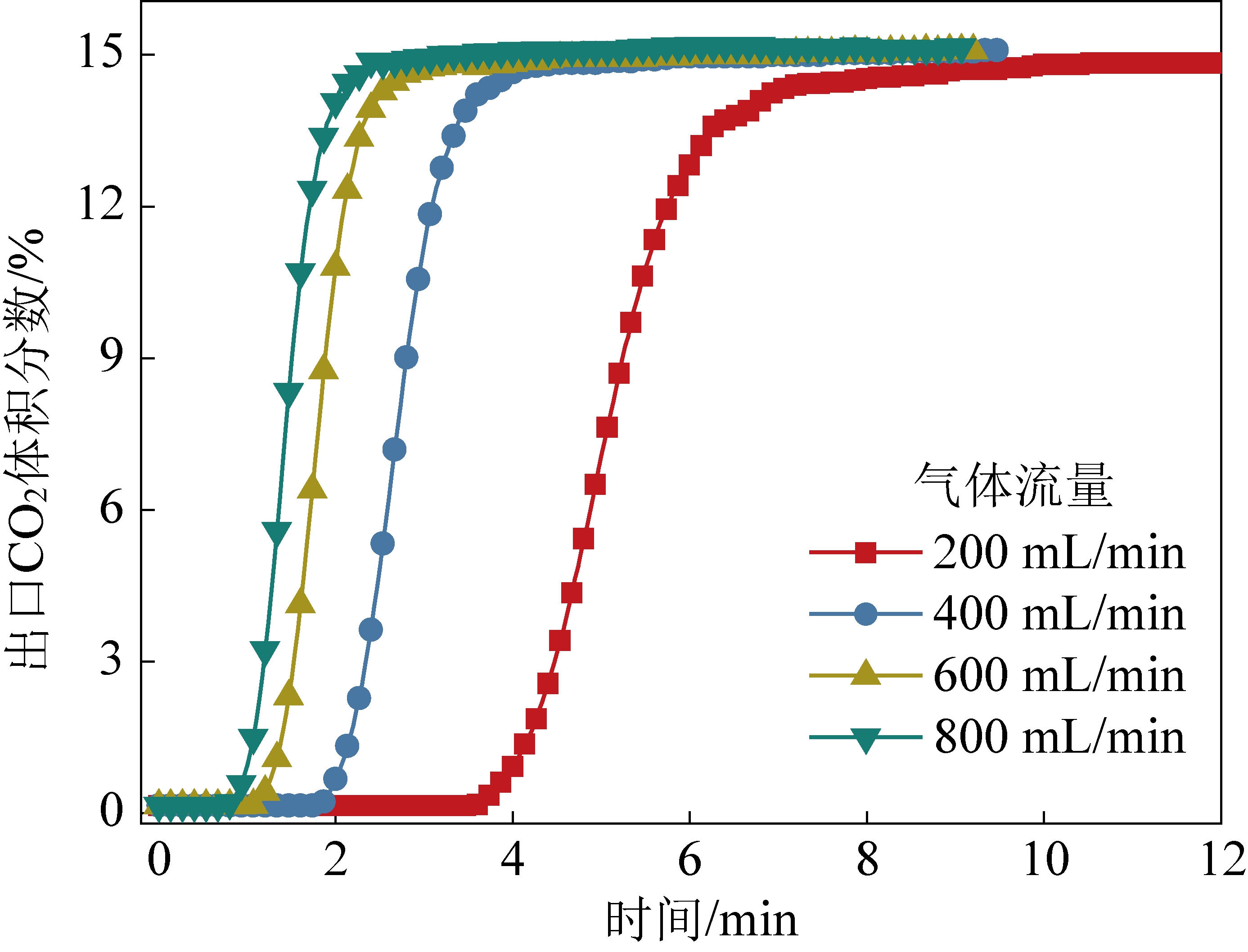 Fig.6 CO2 breakthrough curves at different gas flow rates