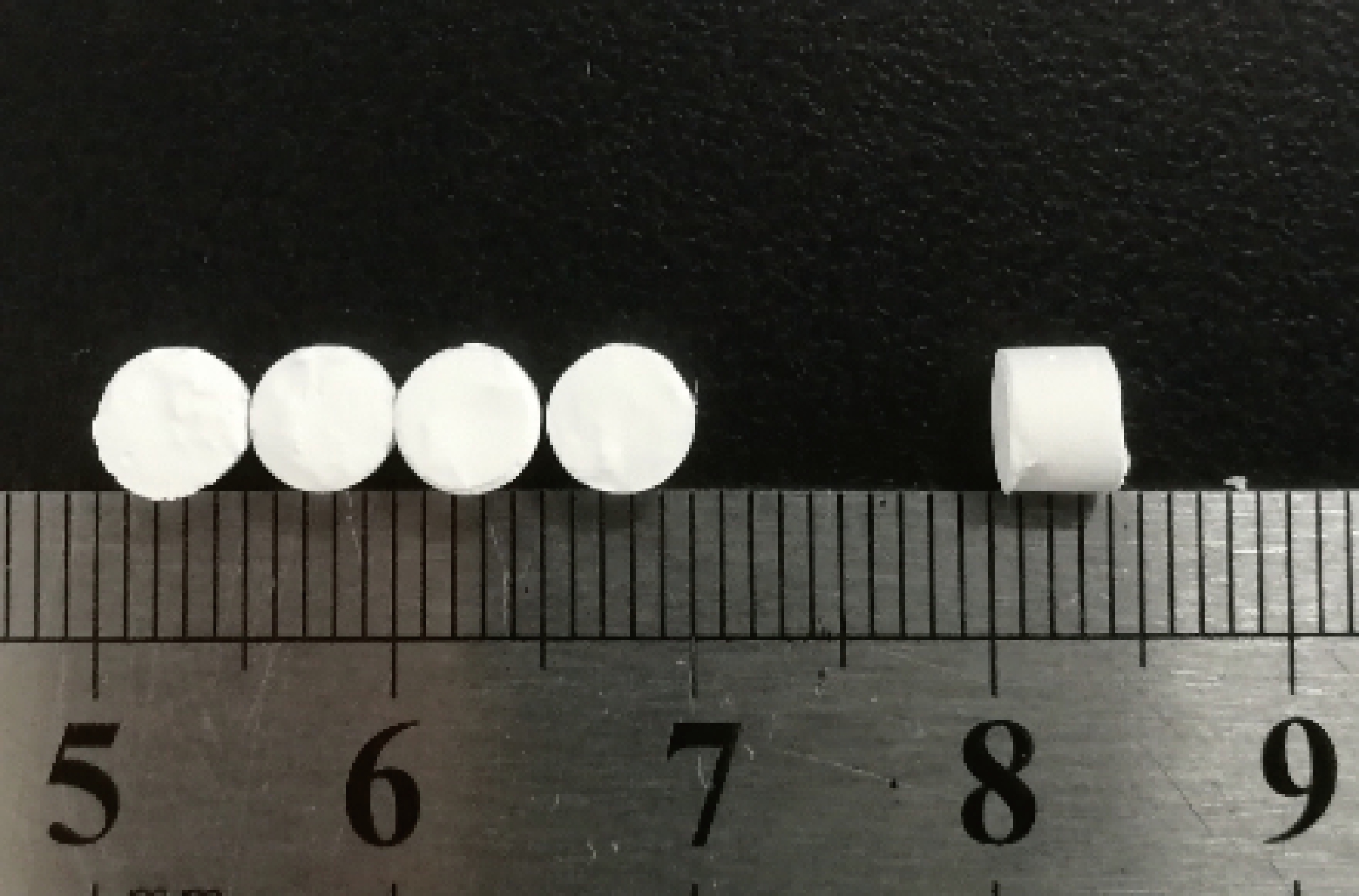 将7.938 g富马酸钠(成都科隆试剂)与9.303 g九水合硝酸铝(成都麦卡希试剂)分别充分溶解于124 mL去离子水中,然后二者混合搅拌10 min后进行多次洗涤、过滤,将最终的产物放入真空干燥箱内100 ℃干燥12 h,即可获得铝富马酸粉末。为进一步制备铝富马酸颗粒,在粉末中添加羧甲基纤维素钠(上海阿拉丁生化科技),羧甲基纤维素钠的质量分数为2.5%。再按照每克混合物添加1.5 g去离子水,搅拌均匀后倒入模具中置于真空干燥箱内,在80 ℃条件下干燥1 h,即可获得直径5 mm、高度4 mm的圆柱体铝富马酸颗粒,如图1所示。