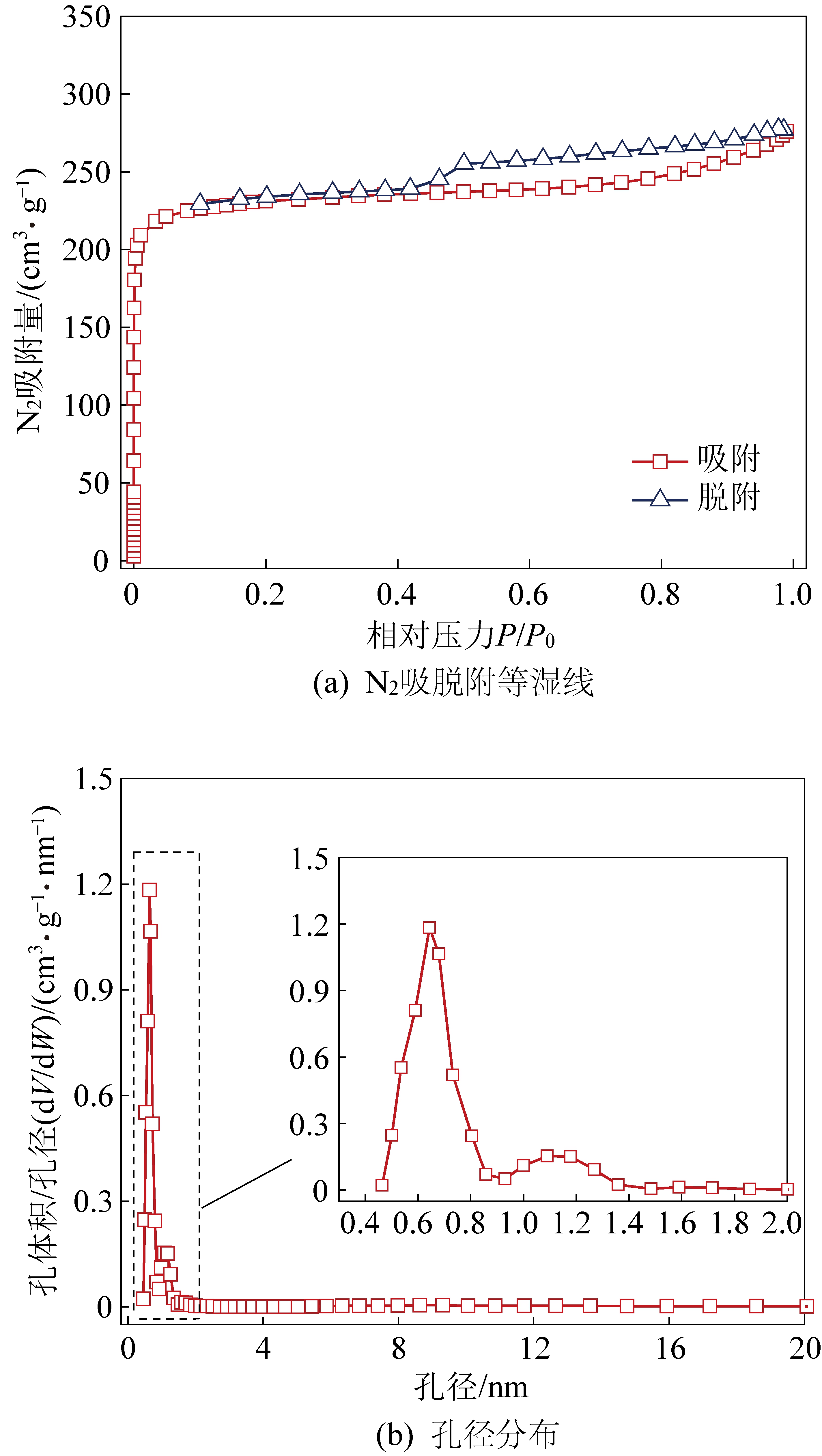 使用ASAP 2460型比表面积及孔隙分析仪测量铝富马酸颗粒在77 K下N2吸脱附情况,结果如图4a所示。N2吸脱附等温线是典型的微孔结构,并且拥有明显的吸/脱附回滞环,表明铝富马酸颗粒具有很高的介孔含量。图4b为铝富马酸颗粒的孔径分布,孔径分布集中在0.6 nm和1.1 nm。颗粒比表面积和微孔容积分别为726.06 m2/g和0.33 cm3/g。