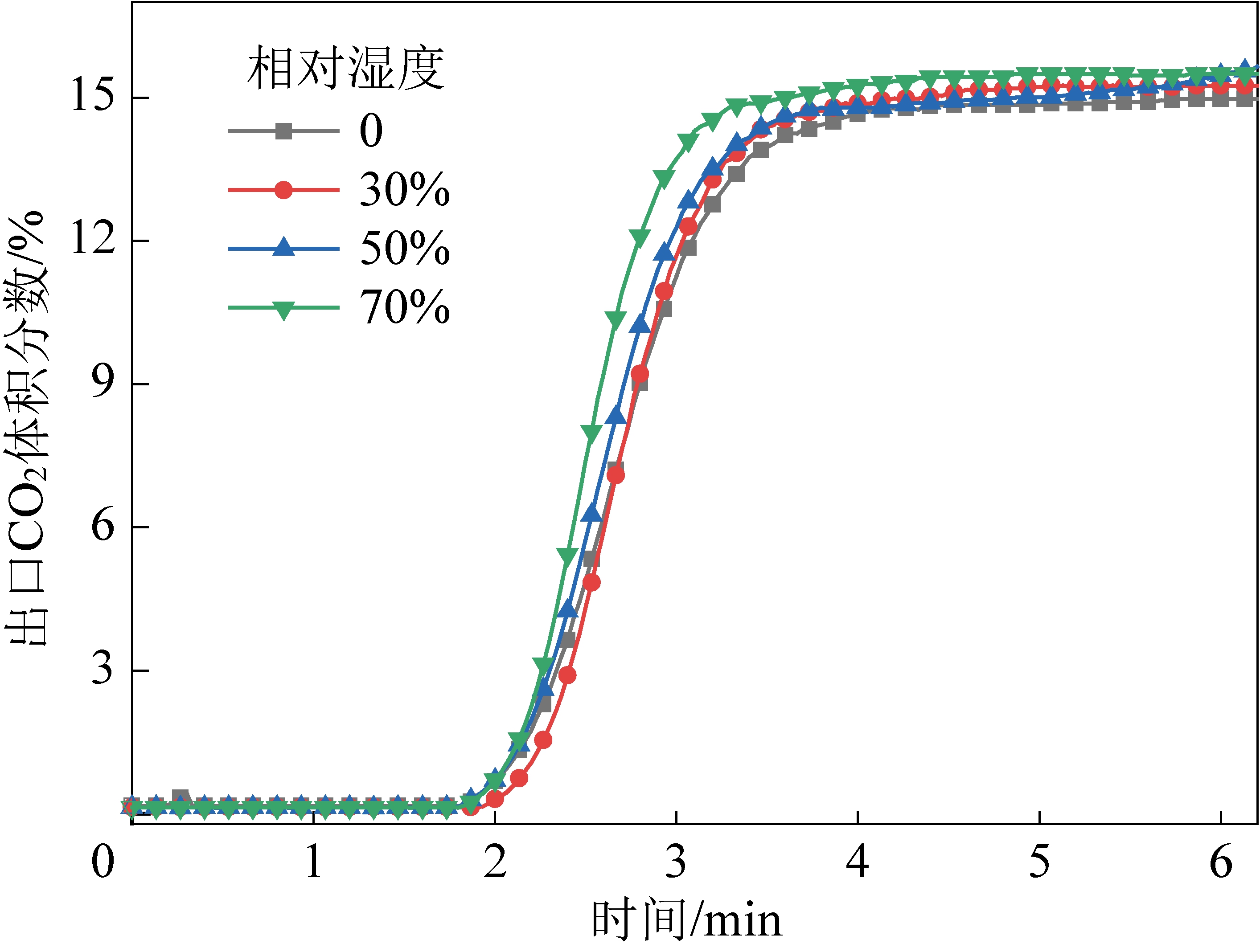 2)在含湿条件下,由于水蒸气的存在会抑制颗粒吸附CO2,并且随着相对湿度增加,穿透时间和CO2吸附量下降。