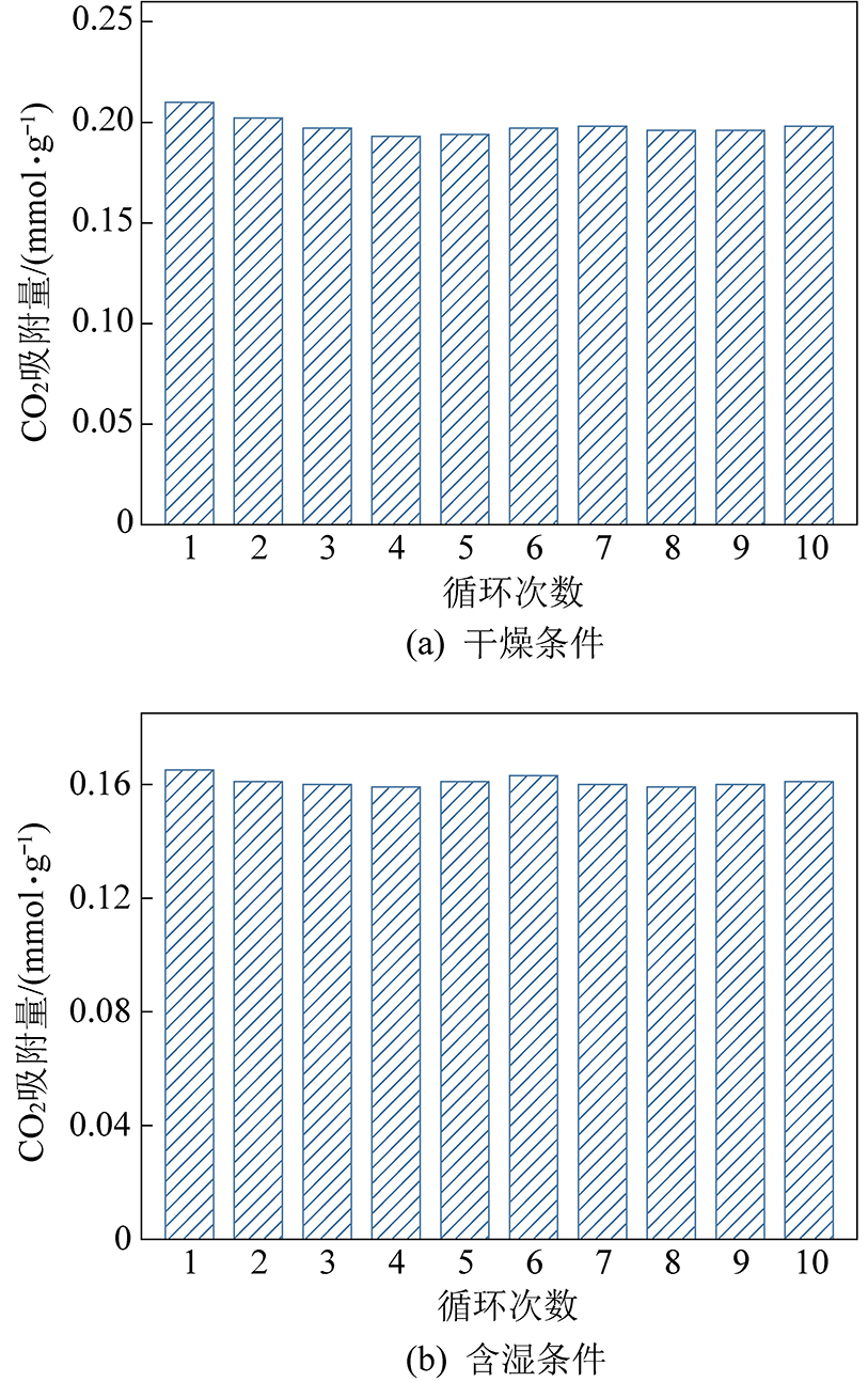 在实际应用中,吸附剂的循环稳定性是影响CO2捕集成本的重要因素,因此测试铝富马酸颗粒在干、湿条件下的循环稳定性对铝富马酸材料的应用具有重要意义。图10为吸附条件为吸附温度50 ℃、气体流量400 mL/min中含有15%CO2时颗粒在10次循环使用过程中的CO2吸附能力比较,颗粒具有良好的循环稳定性。