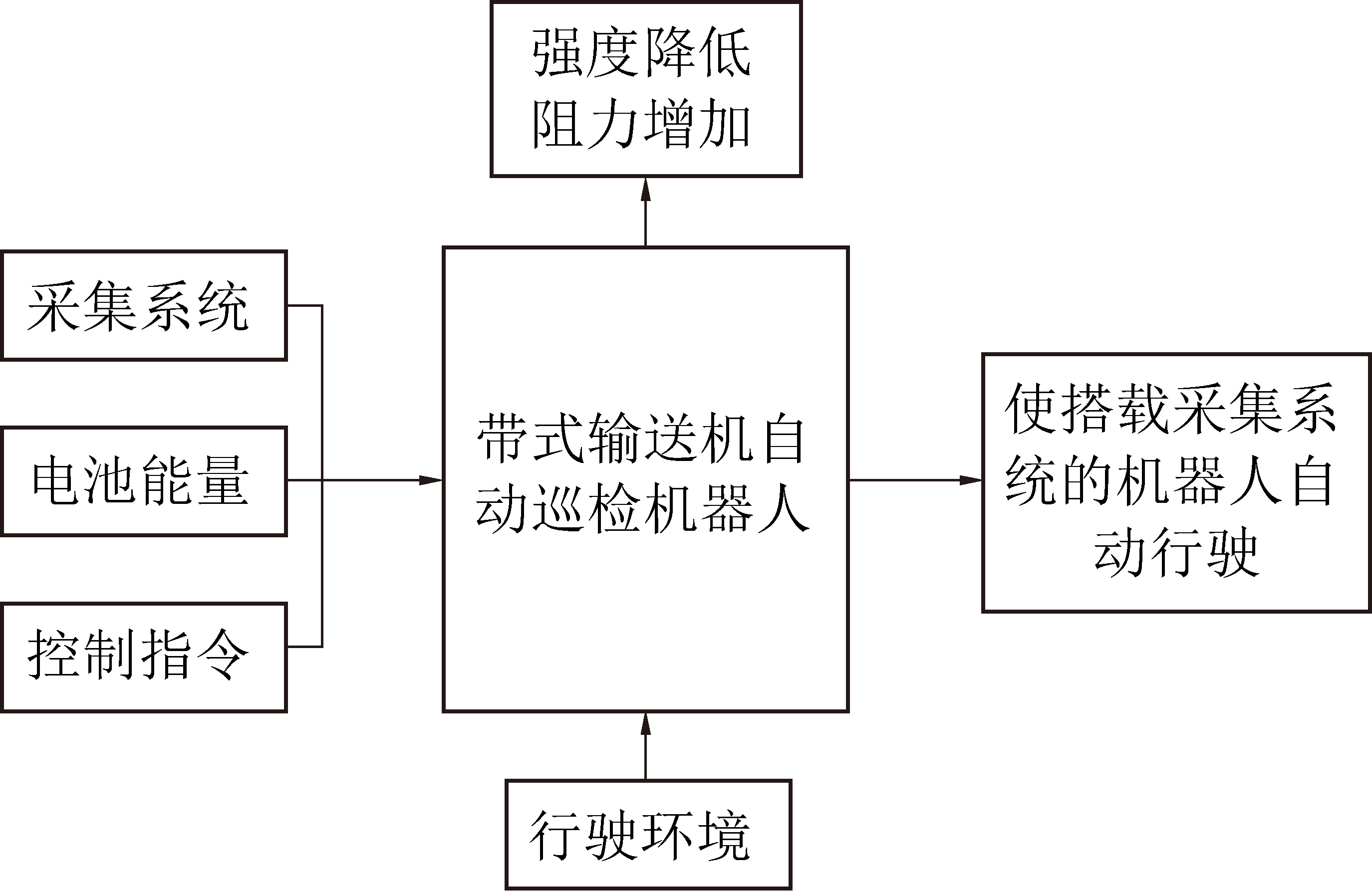 带式输送机自动巡检机器人通过自主行走、自动采集带式输送机关键状态参数,检测出沿线具有潜在或者早期故障的危险点,并将检测的关键状态数据存储并传输到监控中心,为带式输送机运行状态的无人化巡检提供支撑。为快速确定带式输送机自动巡检机器人的总体功能,为下一步的子功能分解提供依据,借助黑箱法的设计思维:将功能定义为能量、物质和信息输入输出之间组合关系,反之,知道了物质、能量和信息之间的转换关系后,便于确定总功能。通过分析可得:带式输送机自动巡检机器人的输入量为监控中心的控制指令和自身自动按钮的信号,输出量为复杂环境下的带式输送机自动往复行走和数据采集,以实现自动巡检这一最终目标,即机器人的总功能,如图1所示。