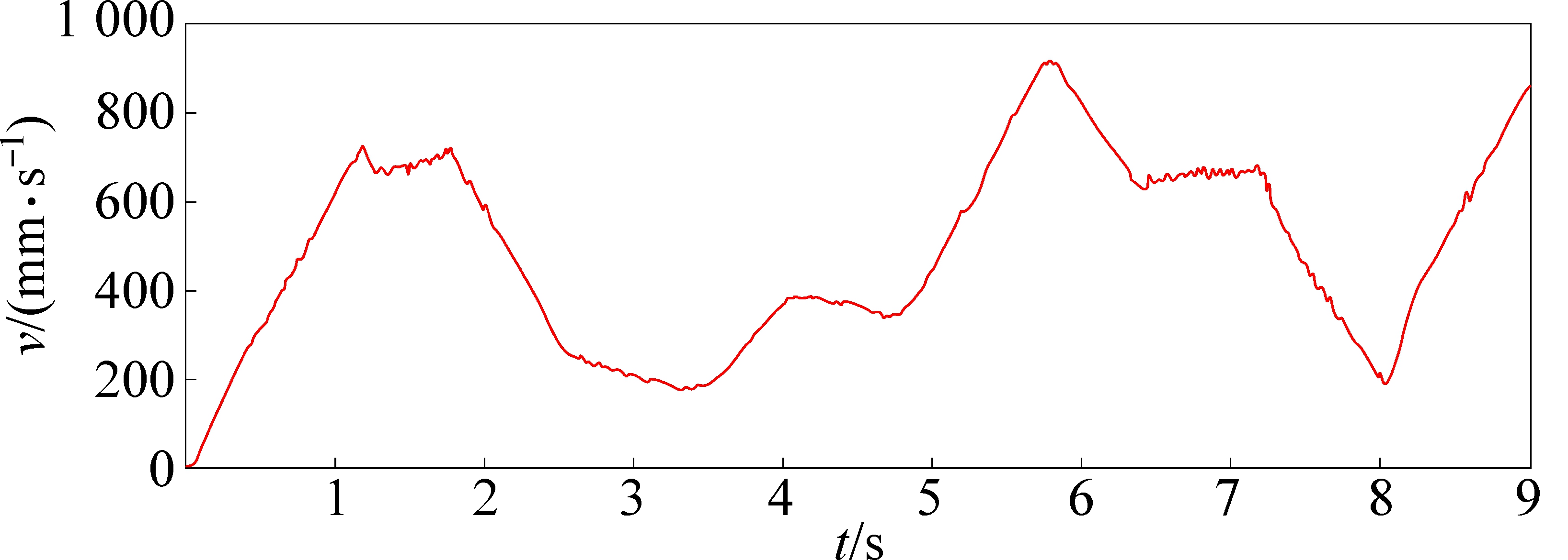 仿真过程中用STEP函数设置巡检机器人运动系统的转矩,即T=STEP(time,0.0,0,0.1,1 100)+STEP(time,2.5,0,2.6,550)+STEP(time,4.0,0,4.1,-550)+STEP(time,5.7,0,5.8,-2 200)+STEP(time,8.0,0,8.1,2 200),如图13所示,上坡运动时转矩最大,下坡运动时电机反转达到刹车的目的。仿真后得到巡检机器人的速度随时间的变化如图14所示,巡检机器人的速度没有出现骤变,说明巡检机器人运动过程中无干涉现象。