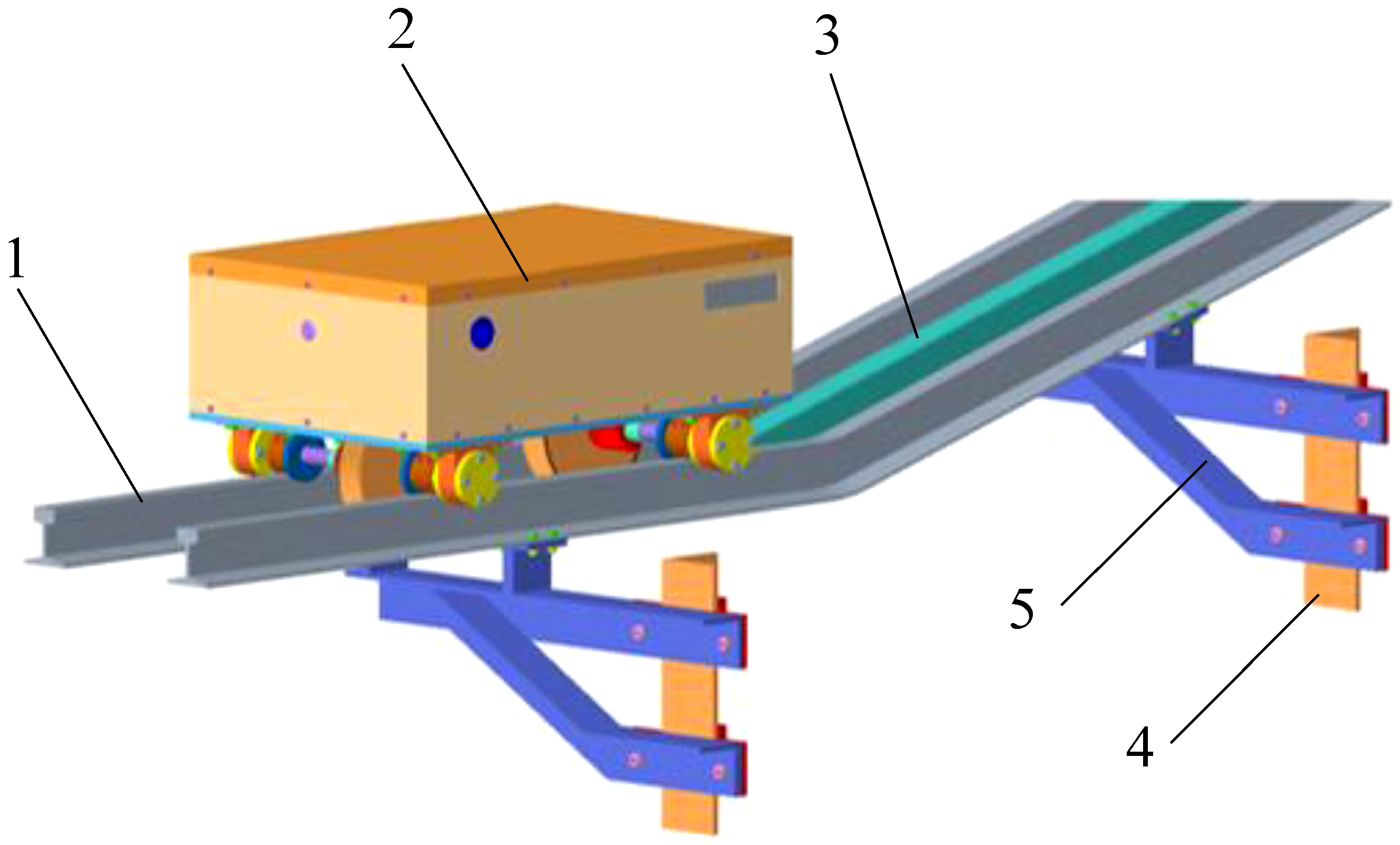 1—轨道;2—巡检机器人;3—齿条;4—立柱;5—托架