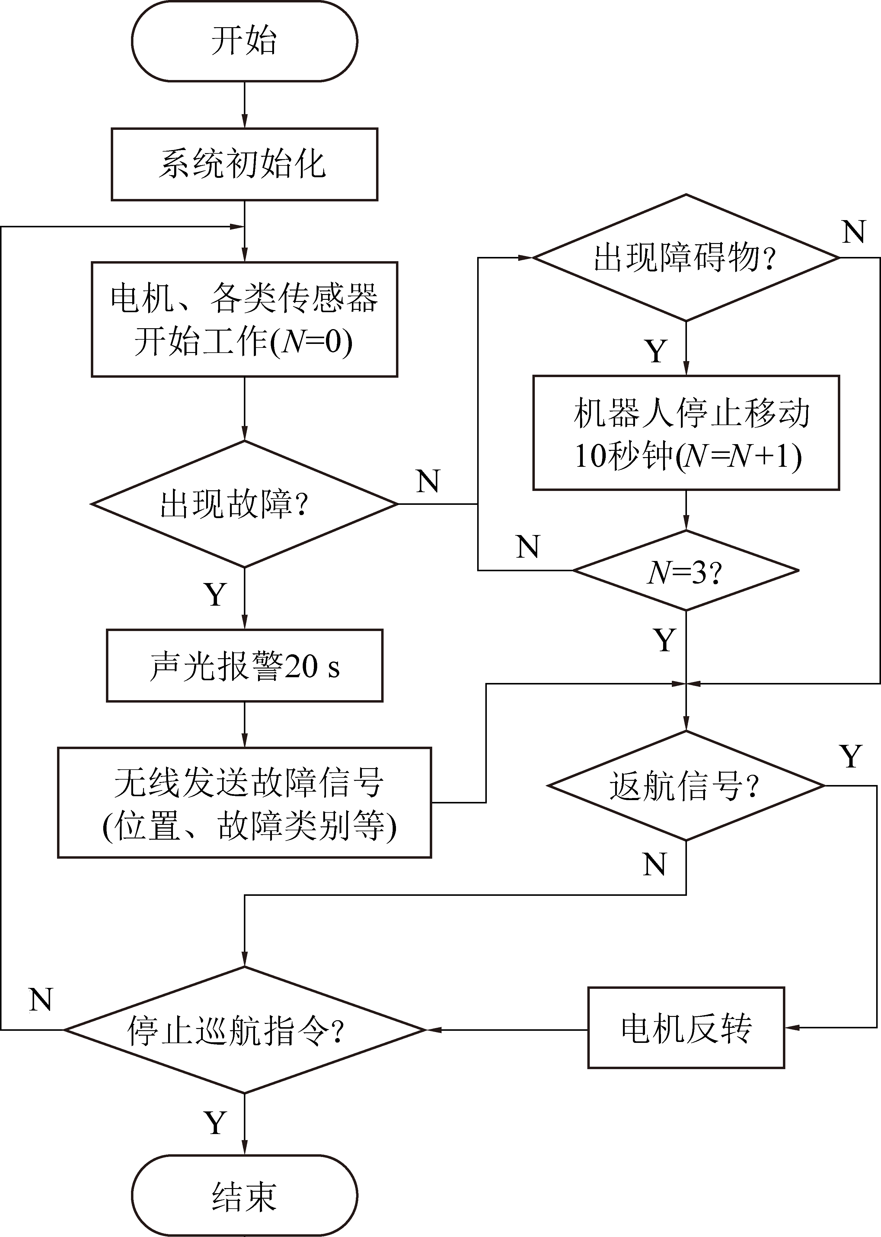 控制系统程序流程如图8所示。上电后巡检机器人首先进行系统初始化,接收机载按钮或无线通信传输的启动指令后,步进电机、摄像头模块、温度传感器、拾音器和超声波传感器等开始启动,巡检机器人开始对煤矿带式输送机进行巡检,采集沿线的传感信息。如果出现明显温度过高的地方,可能出现托辊损坏或输送带打滑等故障;如果出现输送带跑偏、输送带纵向撕裂、输送带横向断裂等故障可以通过摄像头模块的图像进行分析得到;巡检机器人携带的拾音器采集托辊的音频信号,判断是否发生托辊故障。如果巡检系统发现上述异常,巡检机器人发出声光报警,其携带的定位模块确定此时机器人的位置,并通过无线通信模块将故障位置和故障类型等信息传输到上位机。巡检机器人巡检的过程中,如果超声波传感器探测到前方有人、动物或者物体等障碍物,巡检机器人将立即停止移动并发出声光报警。如果前方还有障碍物,判断是否接收到返航指令,如果接收到返航指令,电机反转开始返航。当值巡检机器人接受到停止巡航指令后,立即停止,反之则继续重复上述流程。