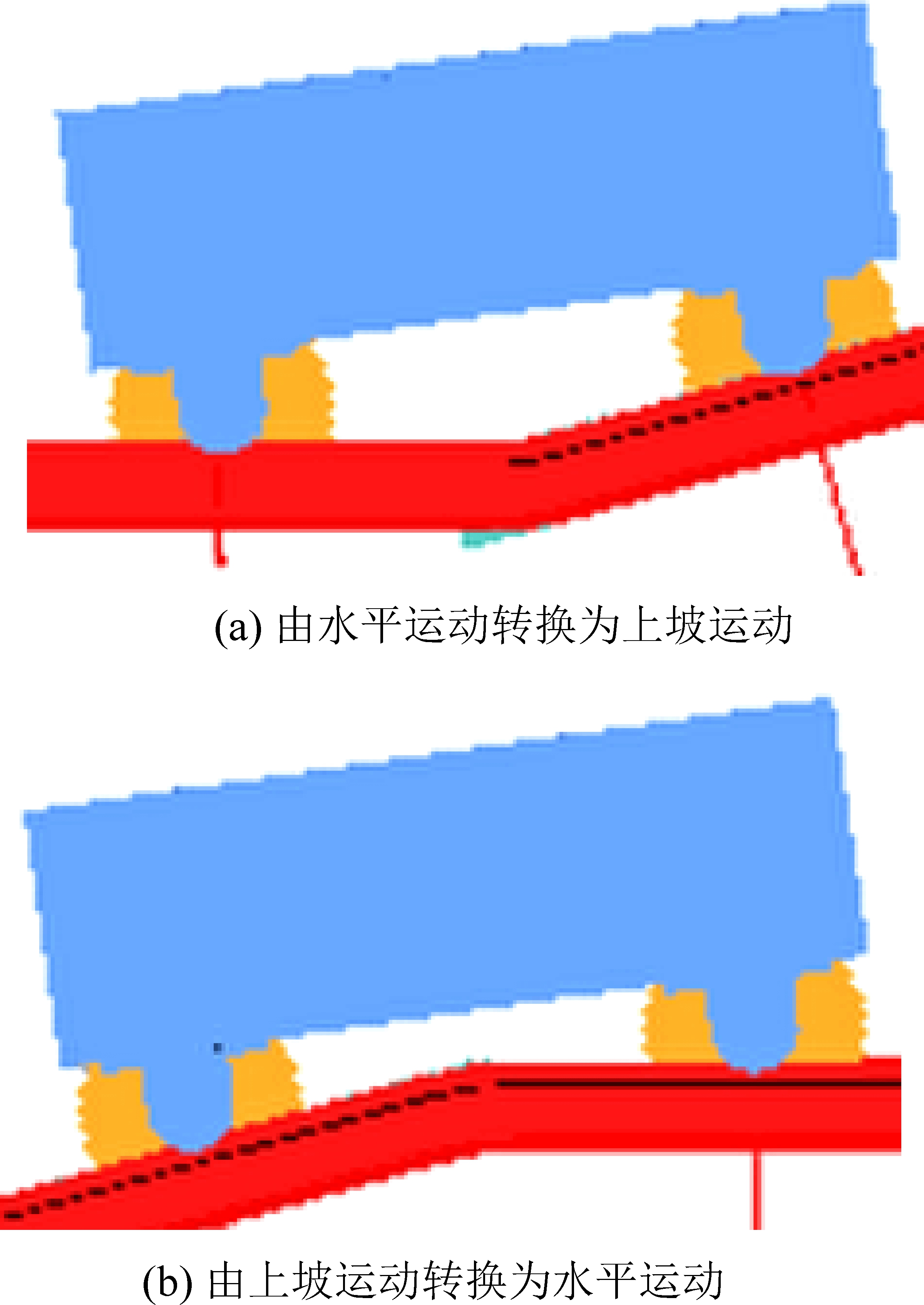如图12a所示,巡检机器人即将由水平运动转换为上坡运动时,机器人位于水平轨道与坡度轨道的交界处,可以看出巡检机器人的前端与坡度轨道的上面不会干涉,巡检机器人的后端与水平轨道的上面不会干涉。如图12b所示,巡检机器人即将由上坡运动转换为水平运动时,机器人位于水平轨道与坡度轨道的交界处,可以看出巡检机器人底板的下面与轨道的上面不会干涉。